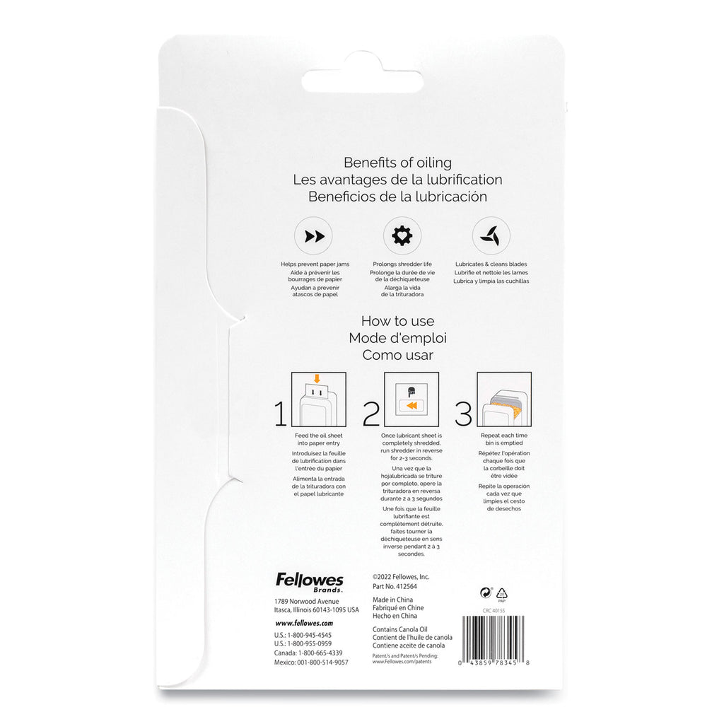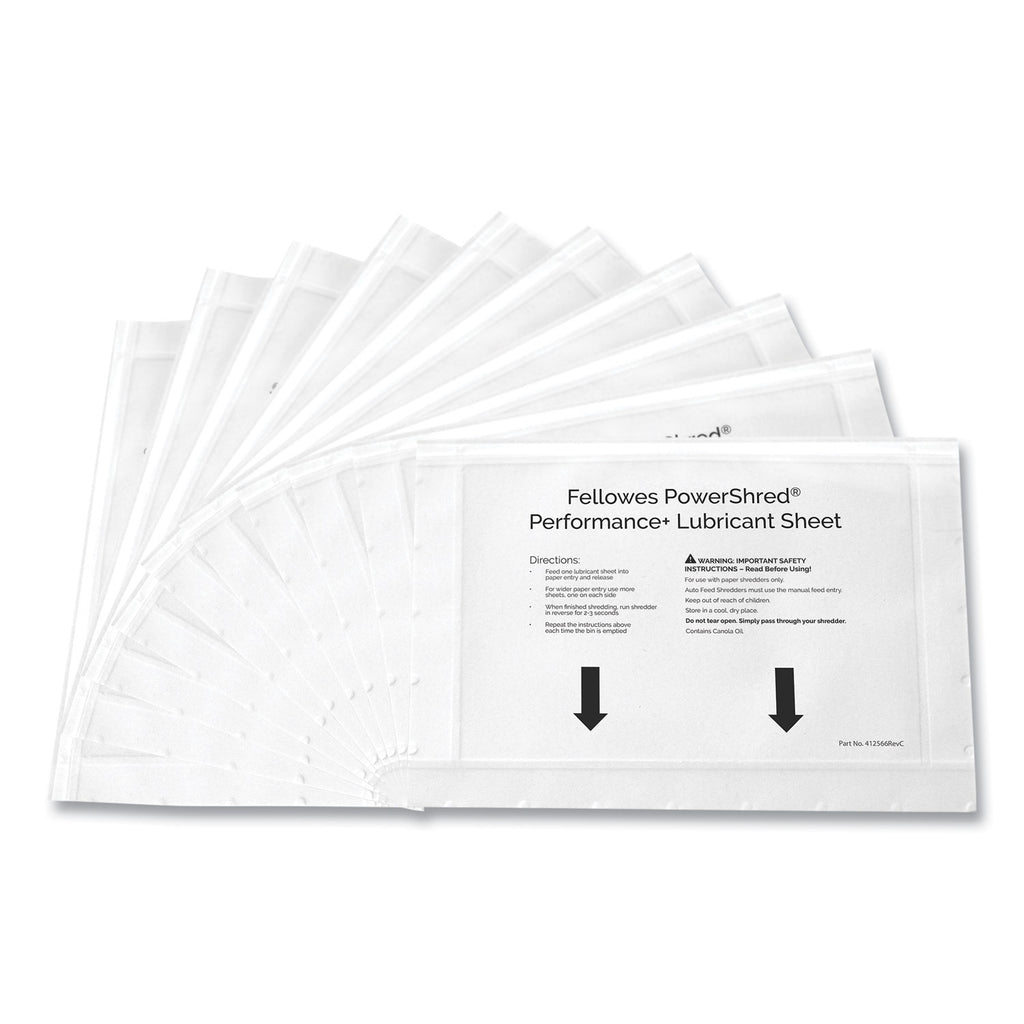 Prolong the life of your shredder and keep it running smoothly. These easy-to-use and mess-free lubricant sheets optimize shredder performance by lubricating and cleaning shredder blades to slow blade wear, reduce paper dust and prevent jams. Simply feed one lubricant sheet into your shredder as you would a piece of paper, and the specially-designed lubricant sheet drives out corrosion-causing agents. For best results, we recommend using a Performance+ Lubricant Sheet each time you empty the waste bin. Sheets are compatible with all cross-cut and micro-cut paper shredders.