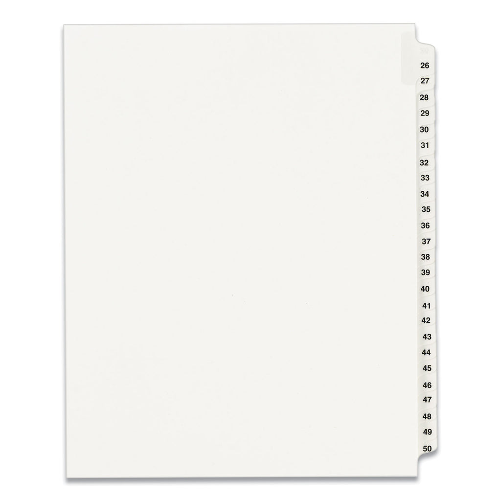 Organize index briefs, legal exhibits, mortgage documentation files and more. White paper stock gives files a professional appearance. Rip-Proof™ reinforced tabs are printed on both sides. Binding edge is unpunched so indexes can fit practically any binding system. Avery Style is Helvetica bold type style and Allstate Style is Helvetica regular type style.