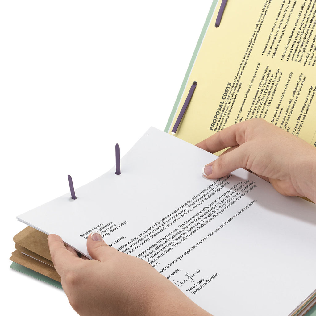 Protect your documents and fingers with patented SafeSHIELD® Coated Fastener Technology—the ultimate solution to fastener issues, including paper tears, finger cuts and excessive fastener crinkling. Heavy-duty classification folders make ideal project files. Sturdy, tear-resistant gusset. Pressboard cover for extra durability.