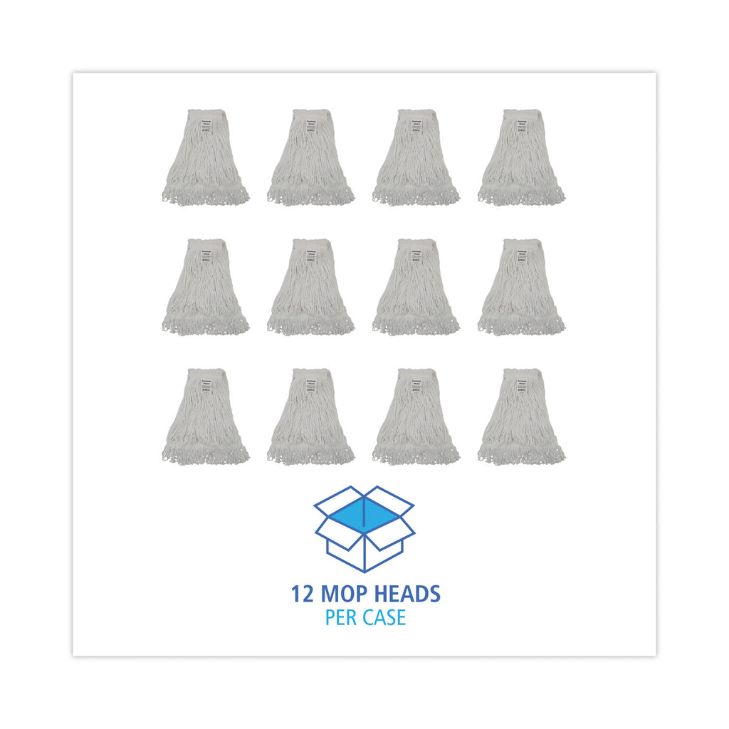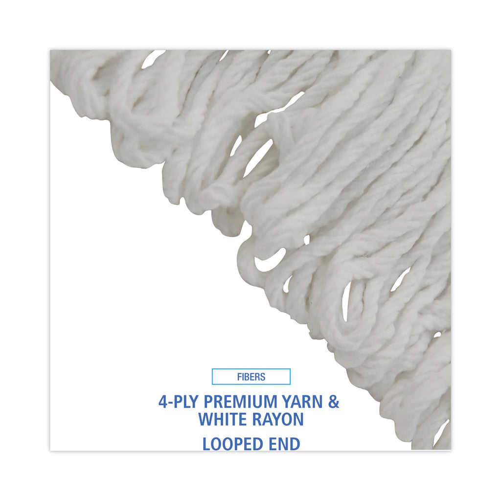 This sturdy mop head is made with premium four-ply yarn and a heavy-duty, polyester tape headband. Constructed with a looped-end design that minimizes less lint, fraying, and unraveling. Built to be durable, the double-sewn tailband prevents tangles and provides more floor coverage. Made from high-quality fiber. Great for general cleaning or floor finishing. For use with clamp style mop handles, which are sold separately.