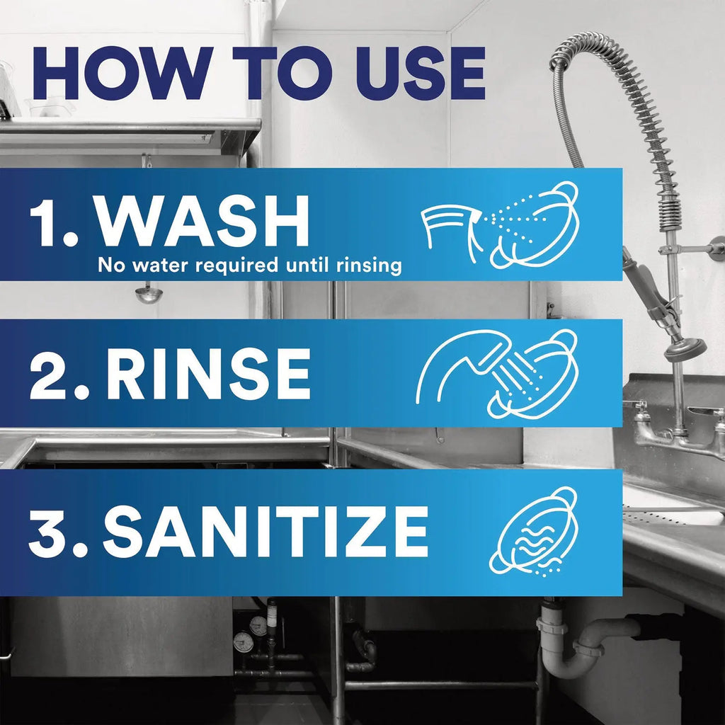 - Simply spray items, wipe away grease, rinse with water and sanitize.