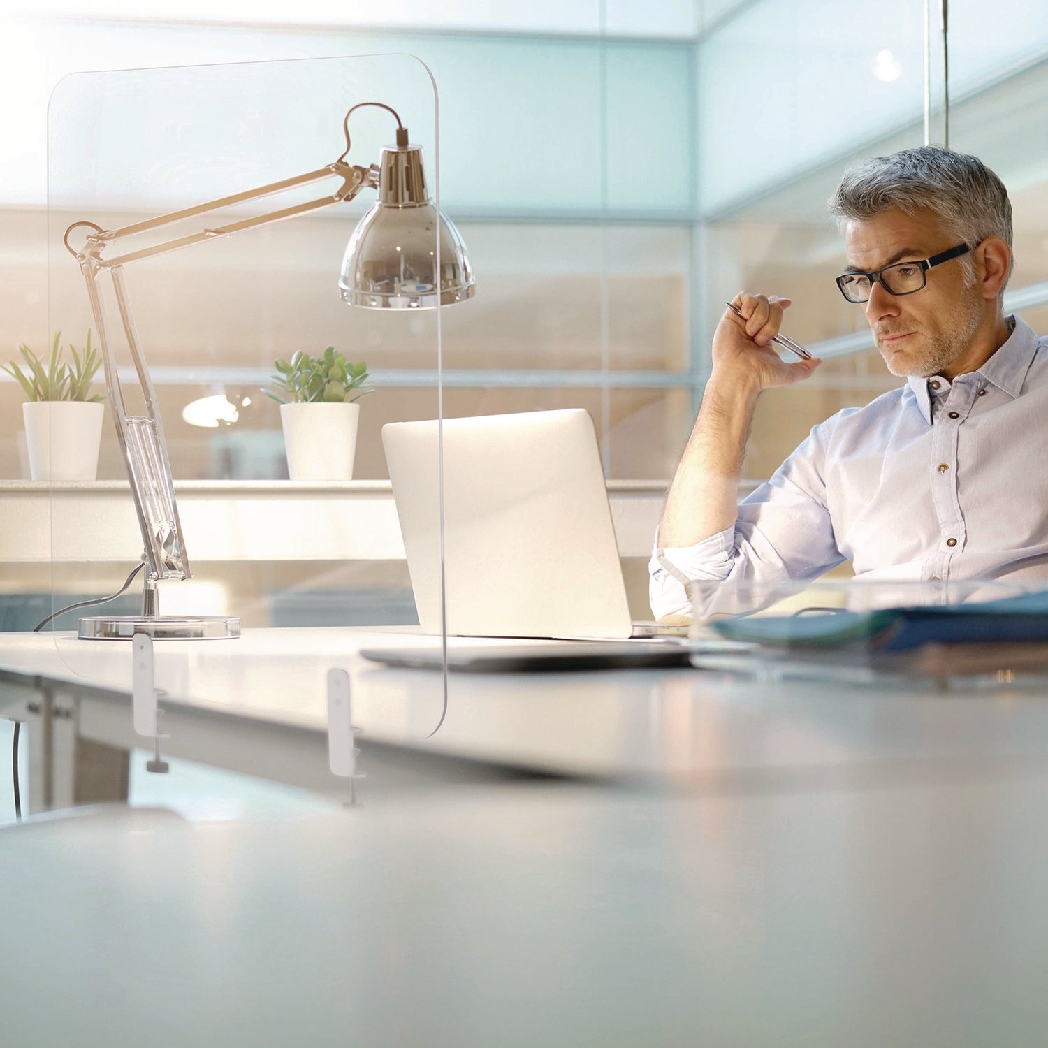 Due to the COVID-19 pandemic, social distancing and personal protection have become the new norm in order to stay safe. MasterVision introduces to you the Protector Series, designed specifically to protect you in public spaces. Desktop Divider is an important tool that helps users maintain contact while still being protected. Ideal for shared office spaces and other public settings. Extremely easy to clean and sanitize. Features a pair of robust clamps which attach to the tabletop or desktop.