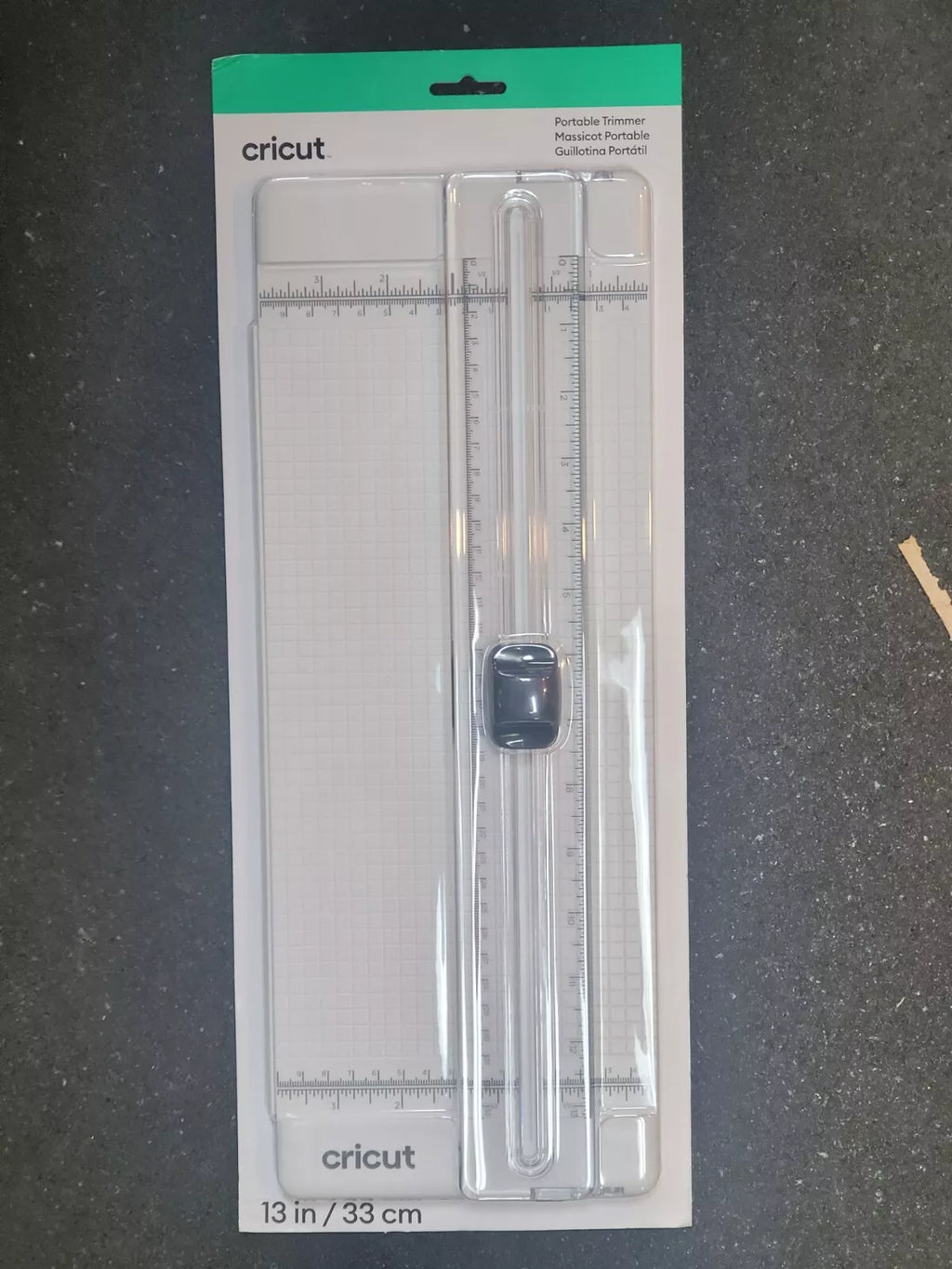It's a cinch to cut straight lines when you use the 13 Cricut® portable trimmer. A unique easy-glide blade system yields precise, straight cuts, while an ergonomic, custom-fit handle provides a smooth grip over hundreds of cuts. The dual-hinged rail makes it simple to quickly load materials, measure, and cut from either side. Continuous measuring marks, rulers in inches and centimeters, and 0.25 grid marks, along with a 16 swing-out arm, help you measure for accurate results. Keep replacement blades in the convenient storage compartments on the underside of the trimmer.