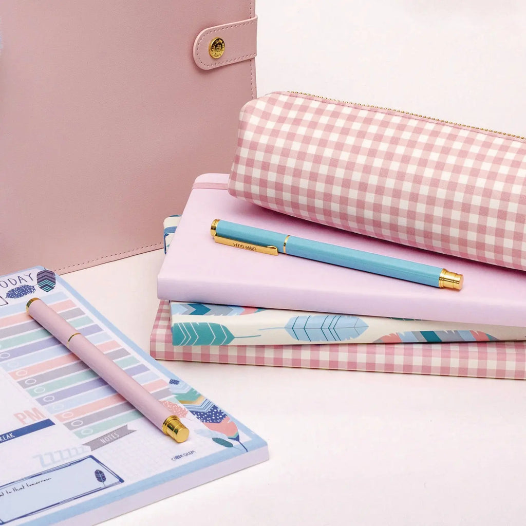 - Featuring classic black gel ink, a gold metal clip and debossed branding writing out your daily notes will never be boring!