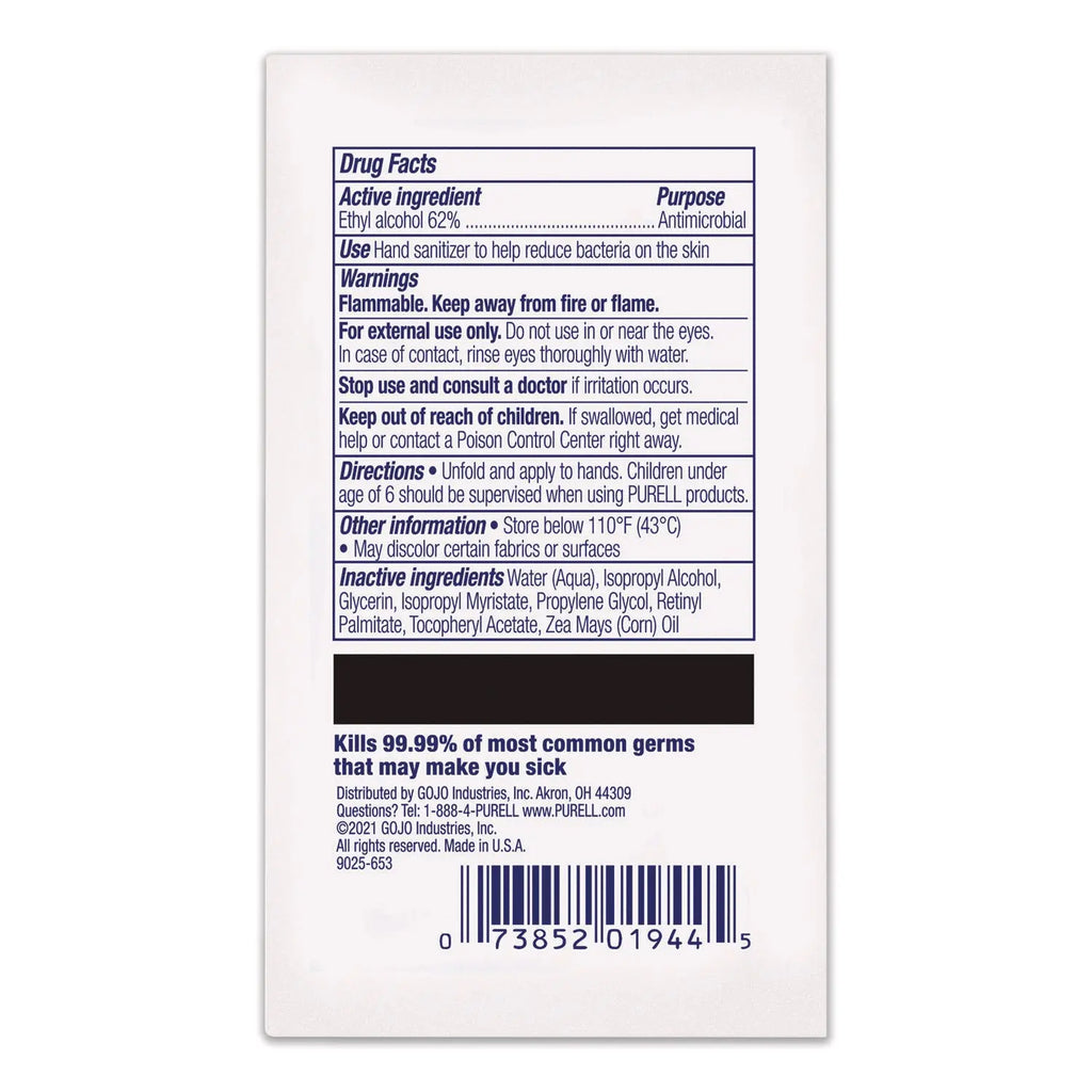 Thick, textured wipes that clean, sanitize and moisturize. Kills 99.99% of the germs that may cause illness. 62% alcohol formulation cleans and sanitizes. aloe, moisturizers, vitamins A and E keep skin soft. Individually wrapped.