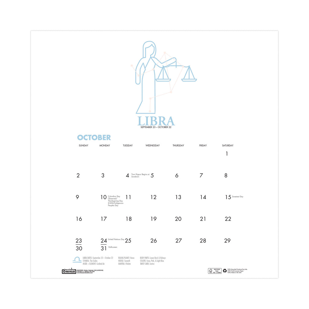 Calendar has a clean open space design printed on heavy-duty 100-lb paper. Each month the zodiac symbol along with the star pattern is displayed with the astrological time frame of the month.