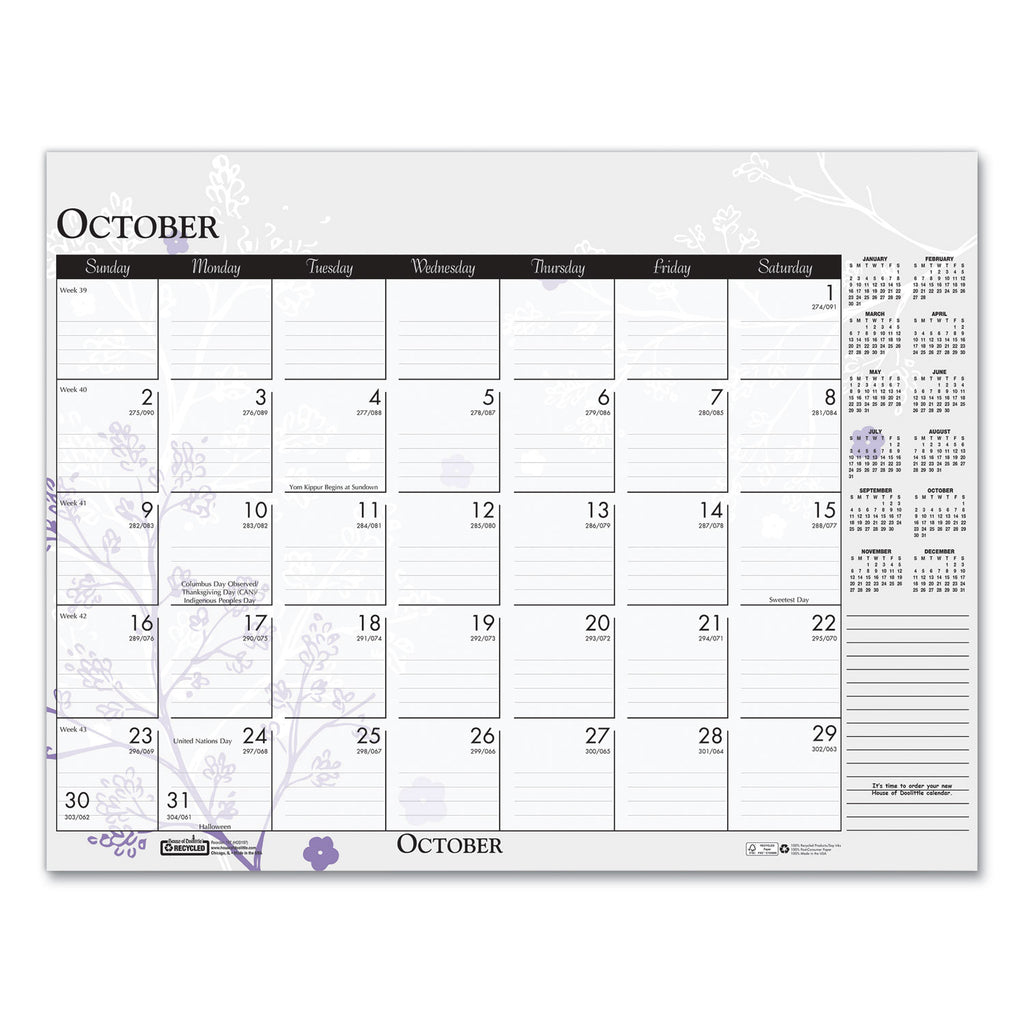 Brighten up your desk with a different wild flower design each month. The pages are bound and perforated at the top with black leatherette binding and matching reinforced corners for durability throughout the year. Full year reference calendar for long term planning. Monthly view on each page featuring ruled blocks allocated for each day. Includes numbered weeks, Julian dates, days remaining, and ample note space. Printed on recycled paper with soy-based inks.