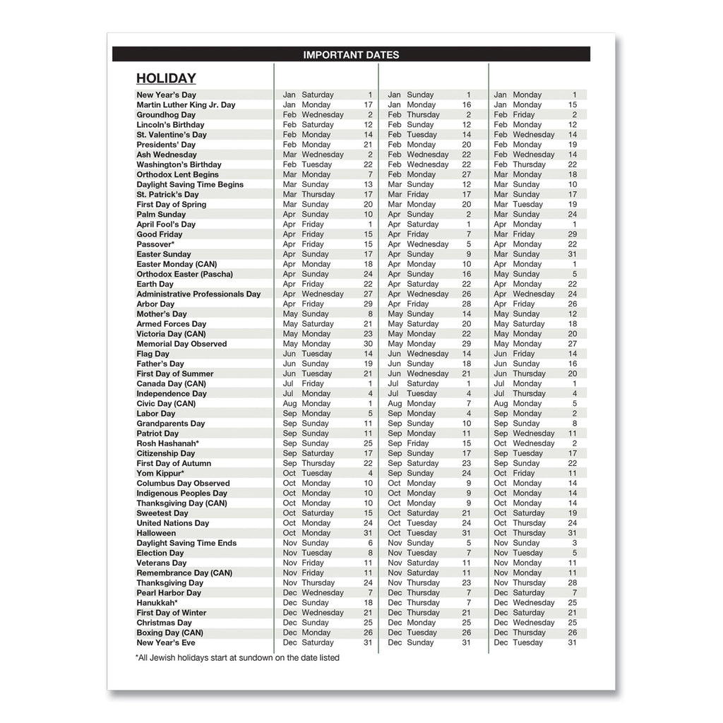 This extended-term planner is perfect for long range planning. A classic monthly view has ample space in the daily blocks for appointments and reminders, each daily block is lined for optimum use. Each two-page monthly spread has generous note space for important information with one prior and future reference calendar. Printed on recycled paper with soy-based inks.