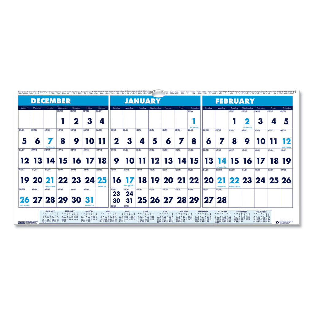 See three months at a time. Wall calendar details the prior, present and following month on each page. Large date numerals with holidays highlighted. Made entirely of recycled materials.