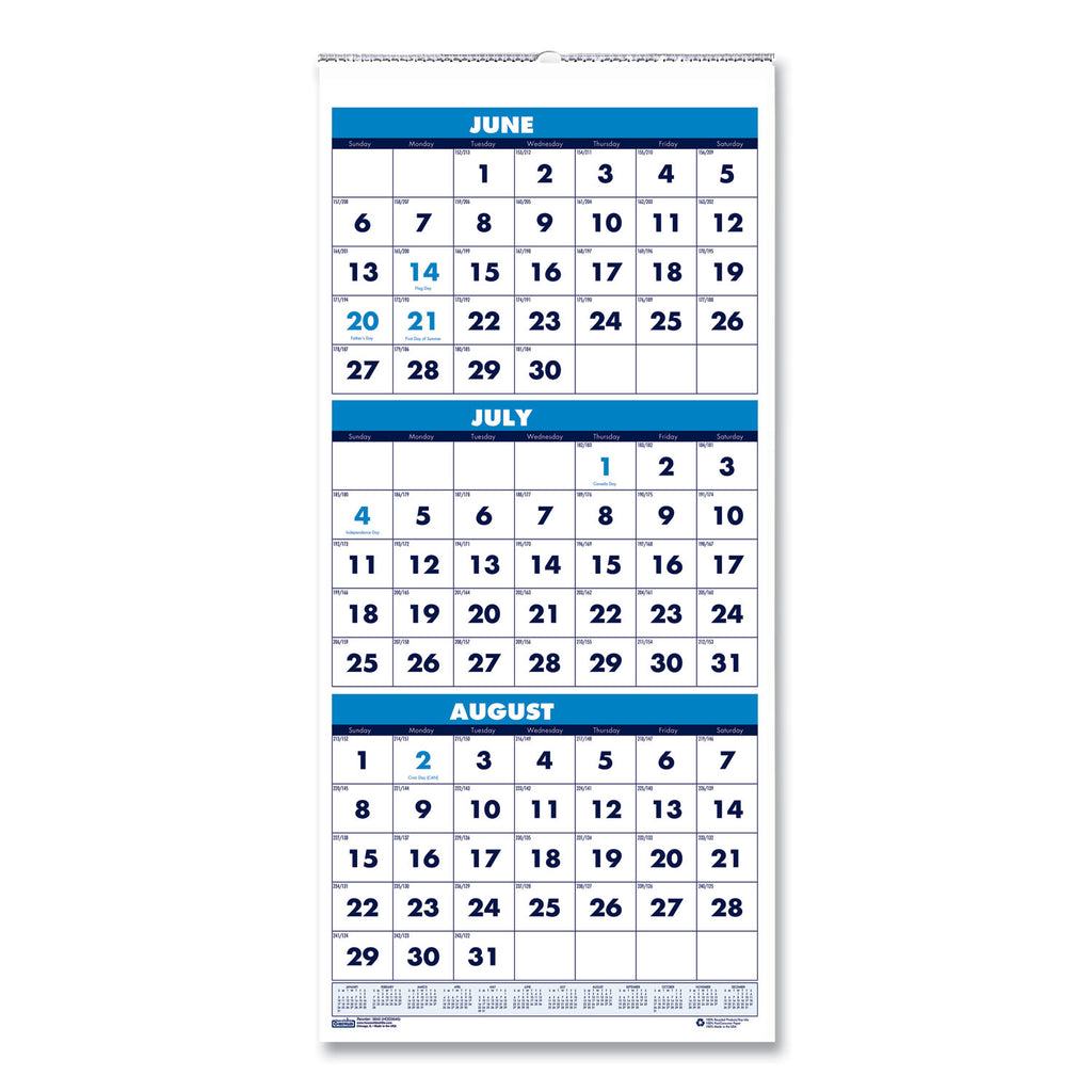 See three months at a time. Wall calendar details the prior, present and following month on each page. Large date numerals with holidays highlighted. Made entirely of recycled materials.