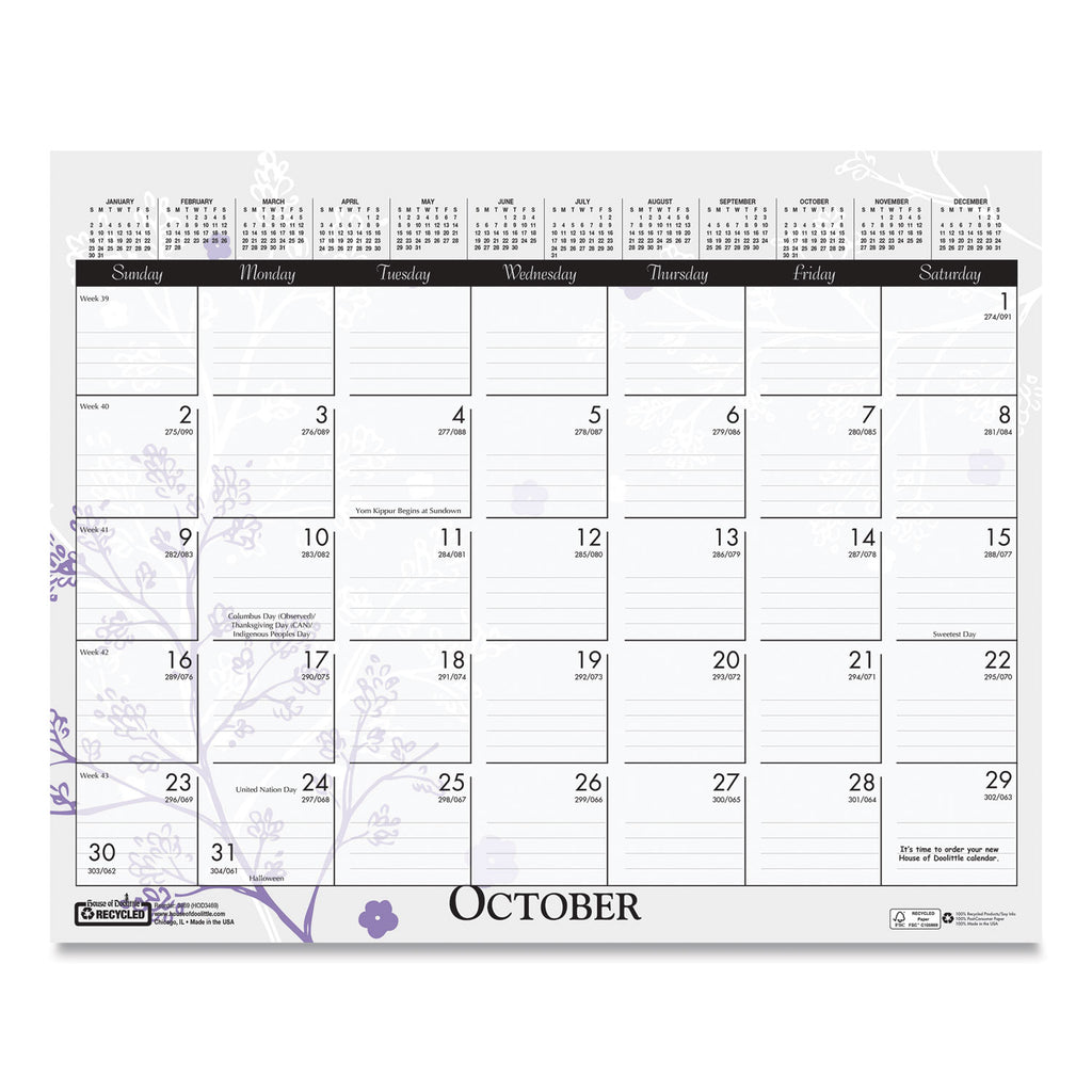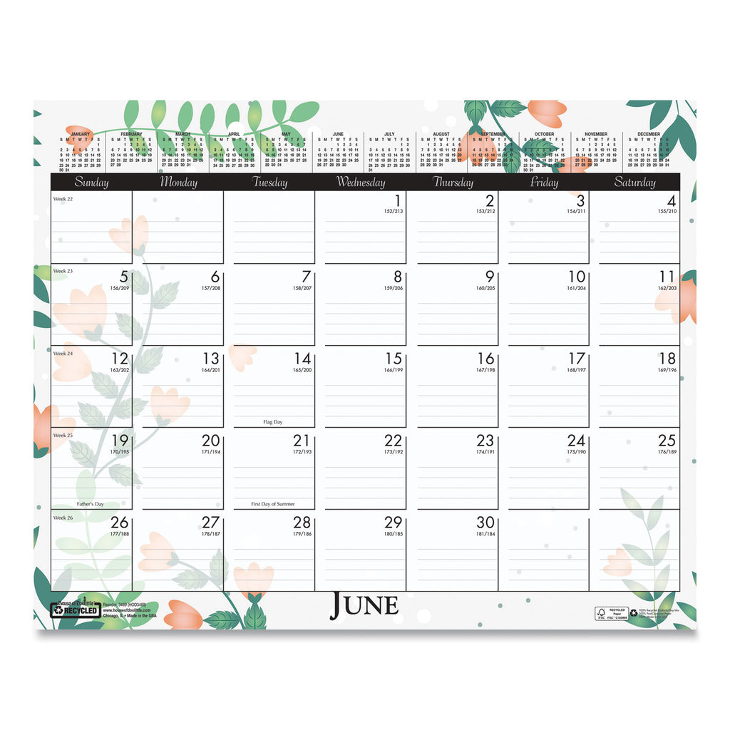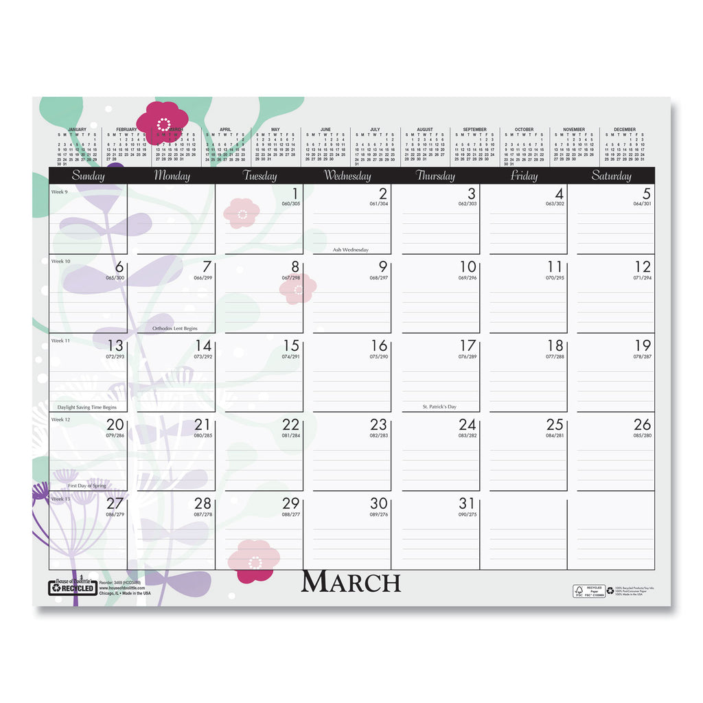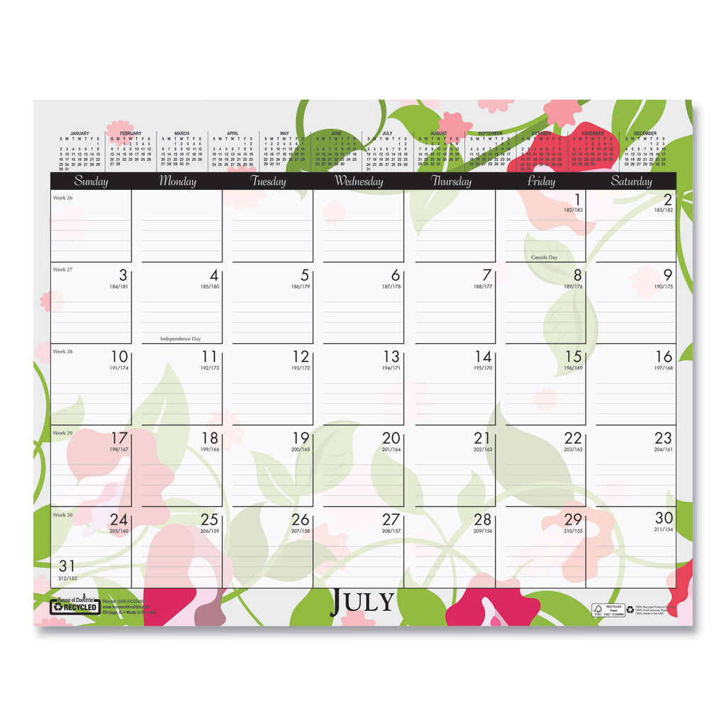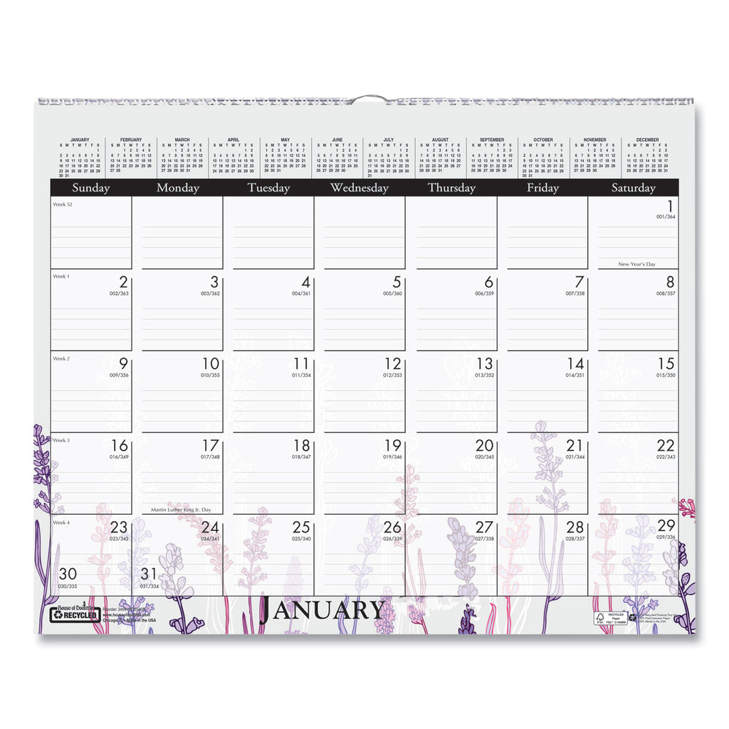 Brighten up your desk. Each month has a different wild flower graphic. Each week is numbered with Julian dates/days remaining. A full year calendar is clearly displayed at the top of each sheet for long-term planning. Strong wire binding and wire hanger. Printed on recycled paper with soy-based inks.