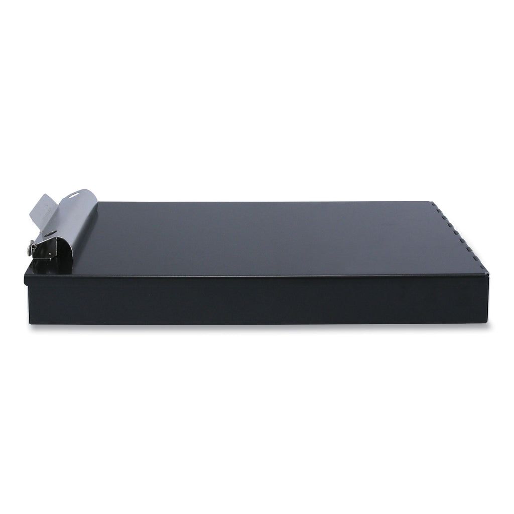 Portable desktop made of durable aluminum, provides a hard surface for readable work and a 1" storage compartment underneath clipboard cover with separate section for pens and pencils. Self-locking latch keeps the compartment securely fastened. High-capacity clip holds up to 1" paper and includes a built-in license/card holder.