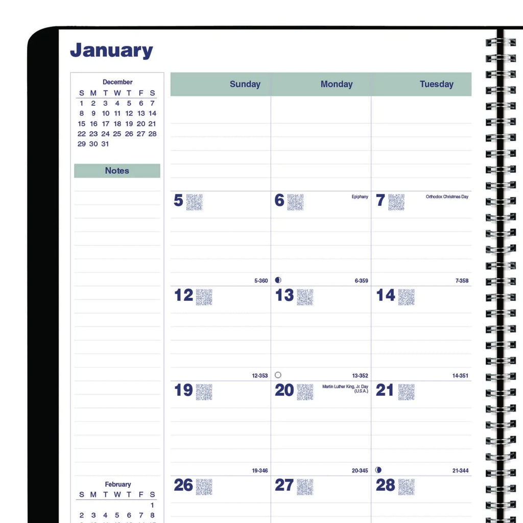 Monthly spreads feature a familiar layout, but each daily block also features a pre-printed QR Code to enable easy integration into the free Blueline® Reminder app. Just plan, scan, click and go. Expanded calendar range easily accommodates annual transitions. Download the free Blueline® Reminder app from the Apple App Store or Google Play.