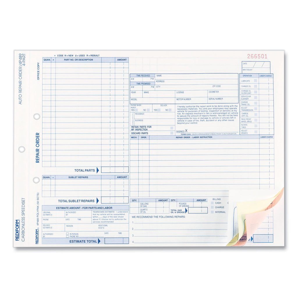 Provides information of items to be serviced, description of parts, materials and estimated cost of labor. Tag stock quadruplicate has form on back for labor/materials recap. Consecutive red numbering expedites filing and bookkeeping.
