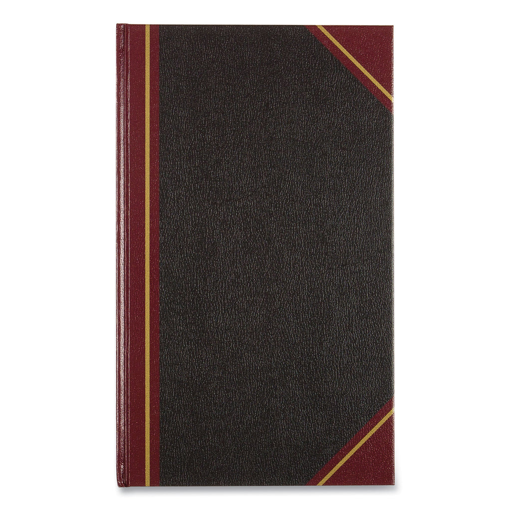 Record book features the classic look of black leather cover with burgundy spine and corners. Faintly ruled pages have margin line. Includes a ribbon bookmark.