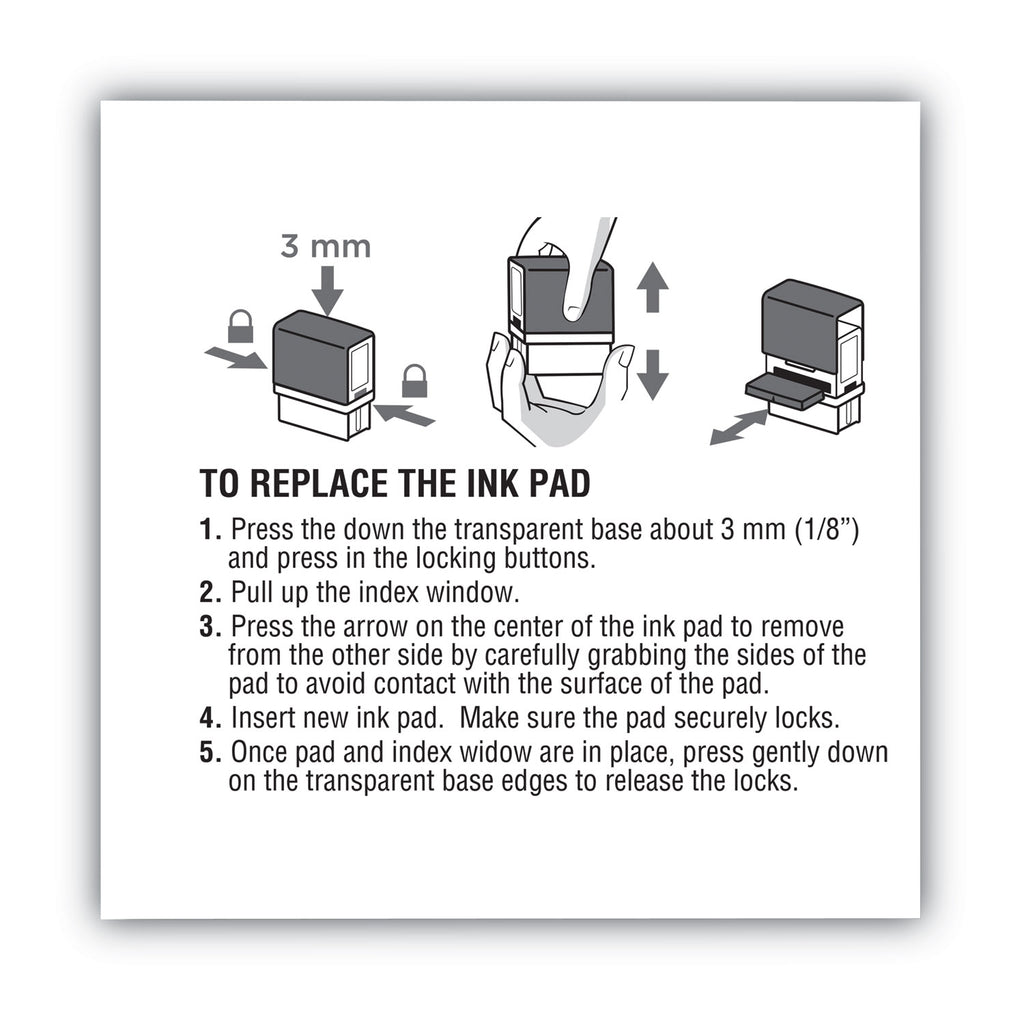 Changing ink pads is easy with this snap in, snap out cartridge style. Delivers up to 5,000 impressions.