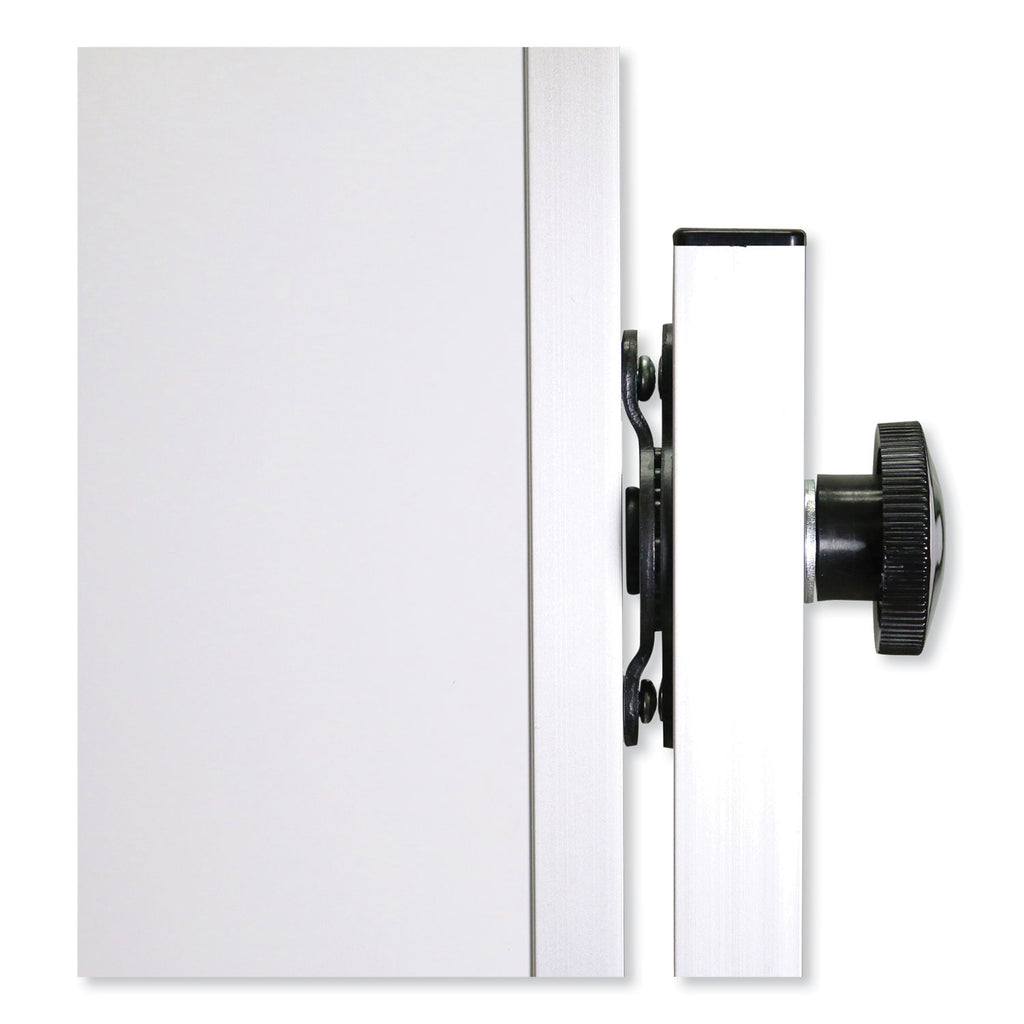 Scratch- and dent-resistant porcelain-on-steel surface ensures that your dry erase board never absorbs ink, eliminating the possibility of staining and ghosting. Quick-reversing mechanism simplifies flipping from one surface to the other, and the strong steel positioning locks clamp-down securely, allowing you to set the surface fully vertical or to any angle in-between. Robust aluminum frame and stand with twin-wheel casters (two locking) keep you mobile.