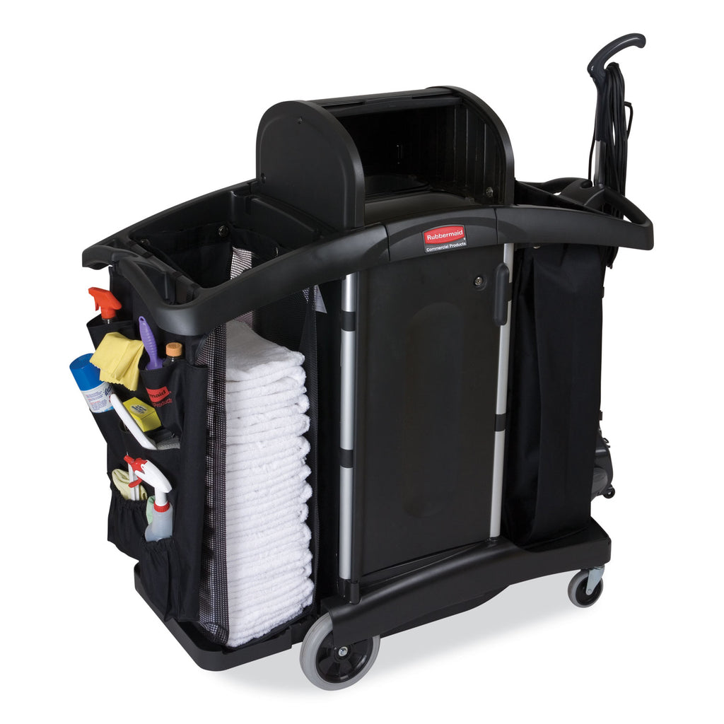 An ergonomic and lightweight housekeeping solution. The janitor cart is constructed of structural web plastic to resist germs. Full-size locking cabinet doors on both sides offer security and click into position when closed to prevent opening while on the move. This housekeeping cart is constructed of aluminum and structural web plastic. 4-inch swivel casters and 8-inch wheels enhance maneuverability. The janitor cart includes compact zippered fabric bag with waterproof PVC lining.