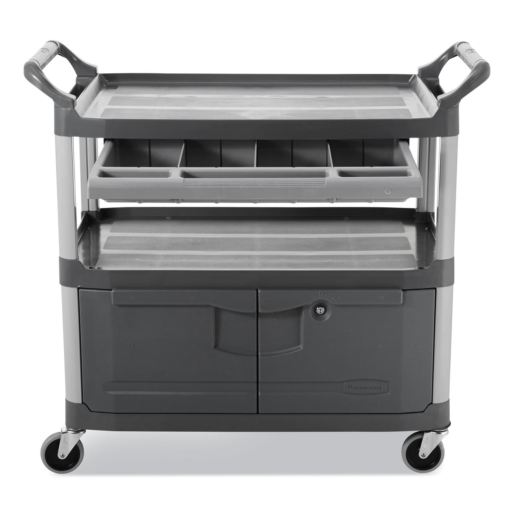 - A rolling utility cart with two shelves, a lockable cabinet and a sliding drawer.