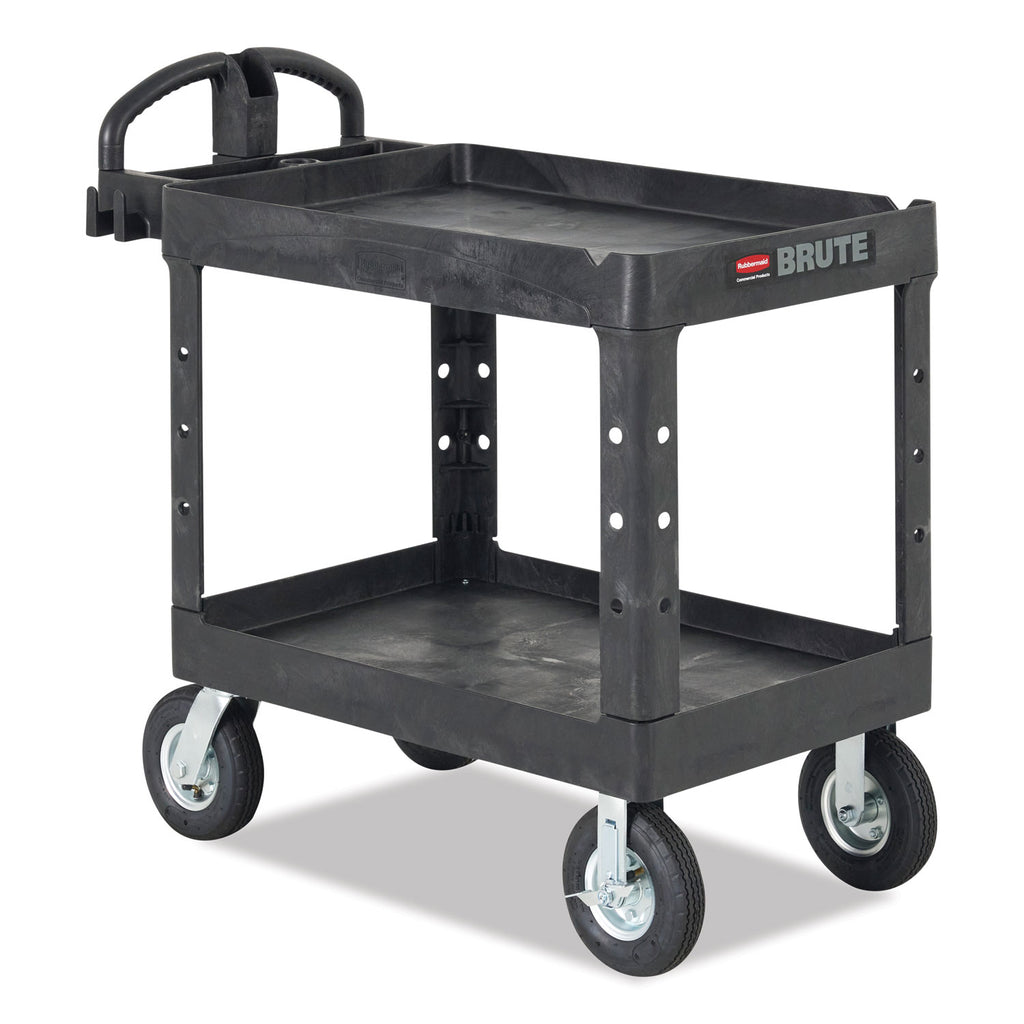 This utility cart is perfect for transporting materials, supplies, and heavy loads in almost any environment. Ergonomically-designed push handle provides optimum hand placement and push height, improving control and worker safety. Molded-in storage compartments, holsters, hooks and notches for ideal storage. The rolling utility cart features molded-in customizable fittings. High-density structural resin construction. Easy-access bottom shelf. Best-in-class casters to meet the most demanding environments.