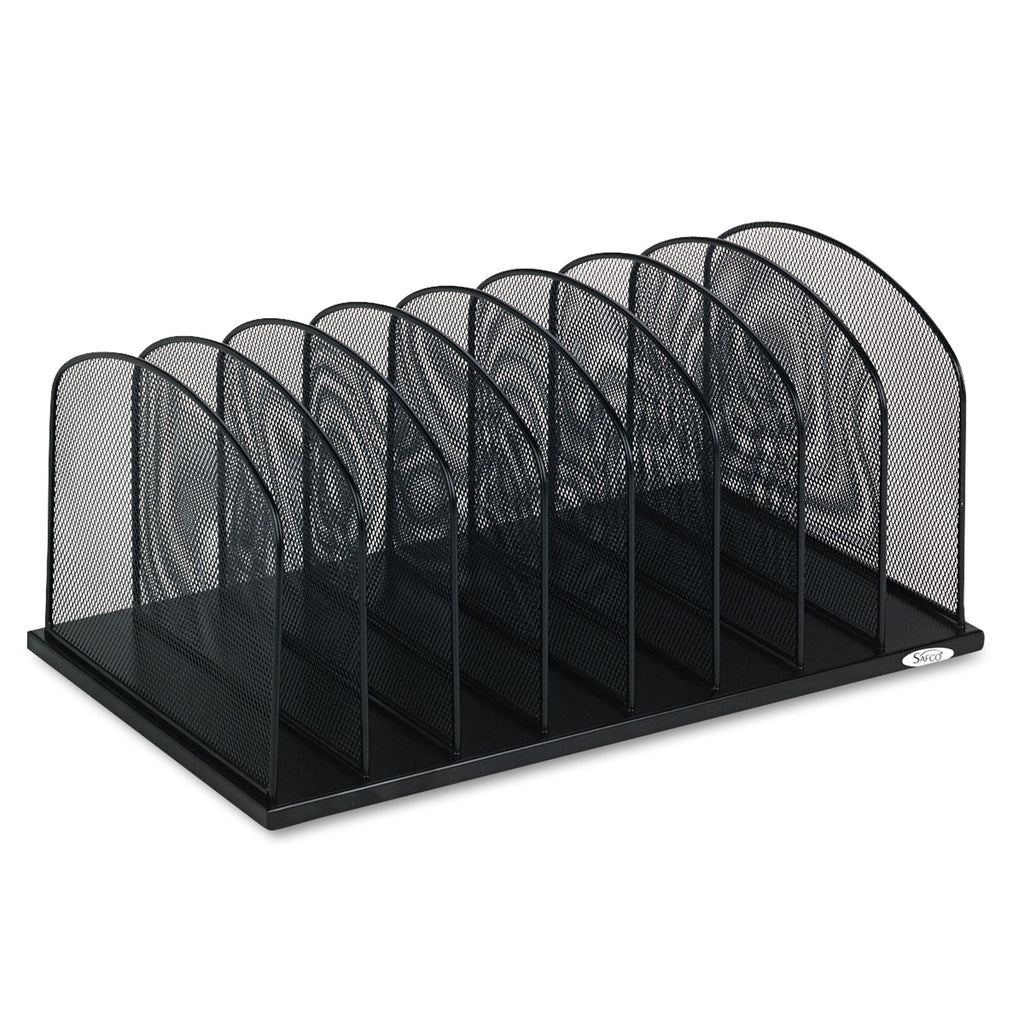Features large-capacity 2" wide vertical sections for holding file folders as well as binders. Steel mesh construction with powder coat finish for durability.