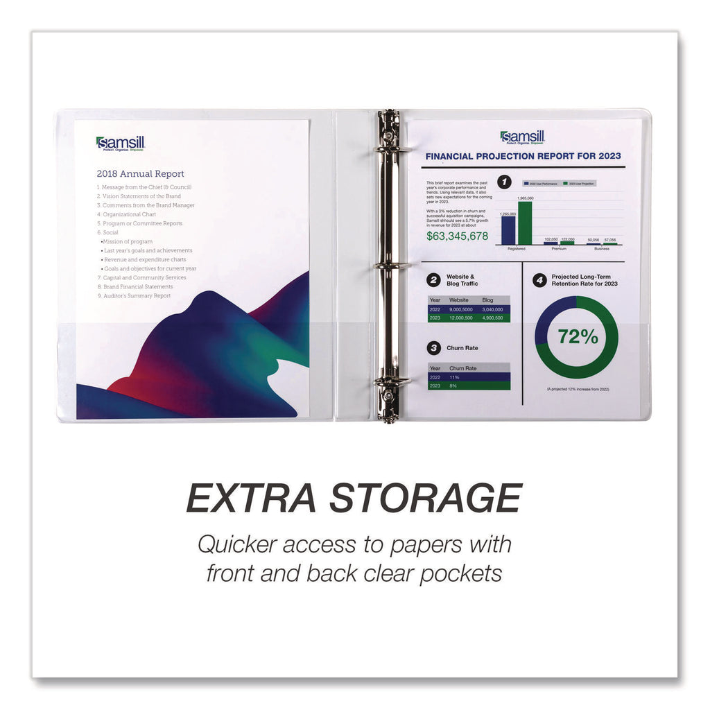 These three-ring binders make indispensable home, office, and school supplies offering the economical paper storage and organizational value you've been searching for. This important document binder features a clear overlay along the front, back, and spine, allowing you to customize your presentations, projects, and more. Non-stick materials are used to make this product, which prevents ink transfer or lifting copy when materials are inserted into the cover or placed inside. Three binder rings with double boosters hold 8.5 x 11 letter-sized sheets with ease. The rings are mounted on the back lid, allowing pages to lay flat while preventing wear and tear on documents. Two clear interior pockets provide additional storage with enough space for notes, photos, business cards, or full-size pages.