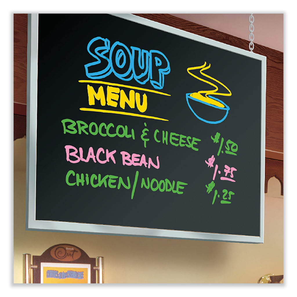 Ideal for restaurants, stores, parties and festivals, black erase boards, white boards and glass. Bright neon color, especially under ultraviolet light. The certified water-based ink easily wipes off non-porous surfaces with a damp cloth.