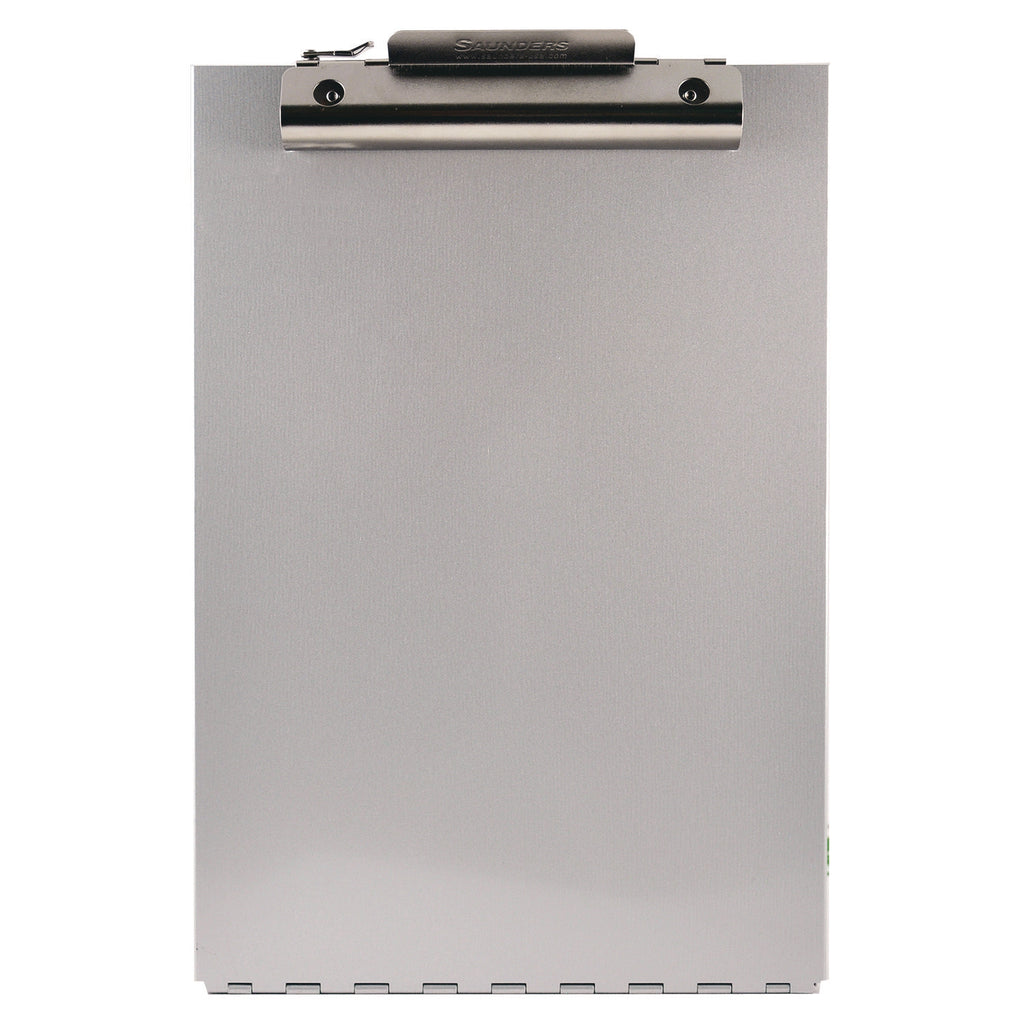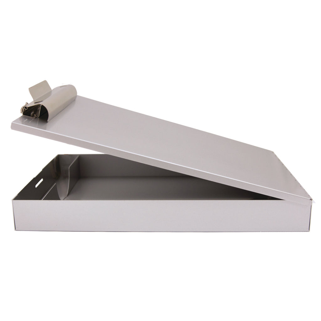 Portable desktop made of durable aluminum, provides a hard surface for readable work and a 1" storage compartment underneath clipboard cover with separate section for pens and pencils. Self-locking latch keeps the compartment securely fastened. High-capacity clip holds up to 1" paper and includes a built-in license/card holder.
