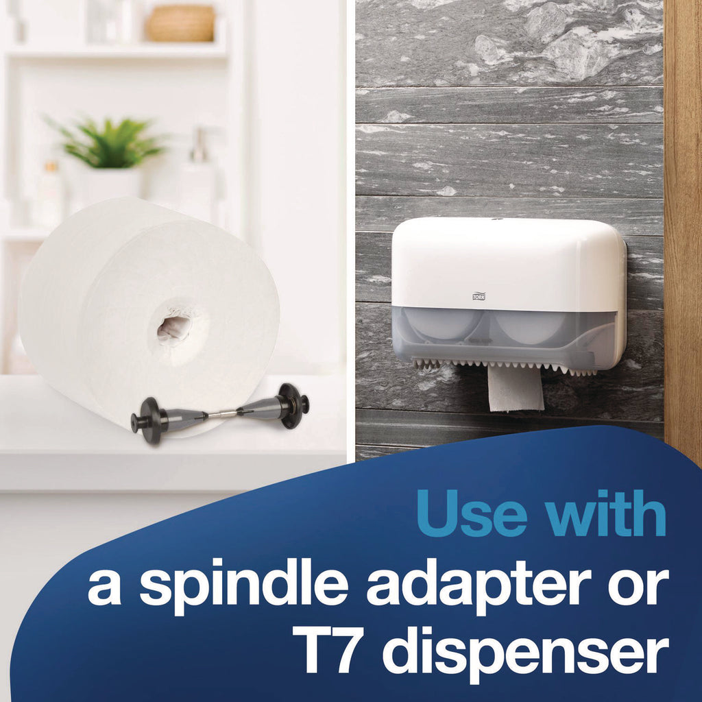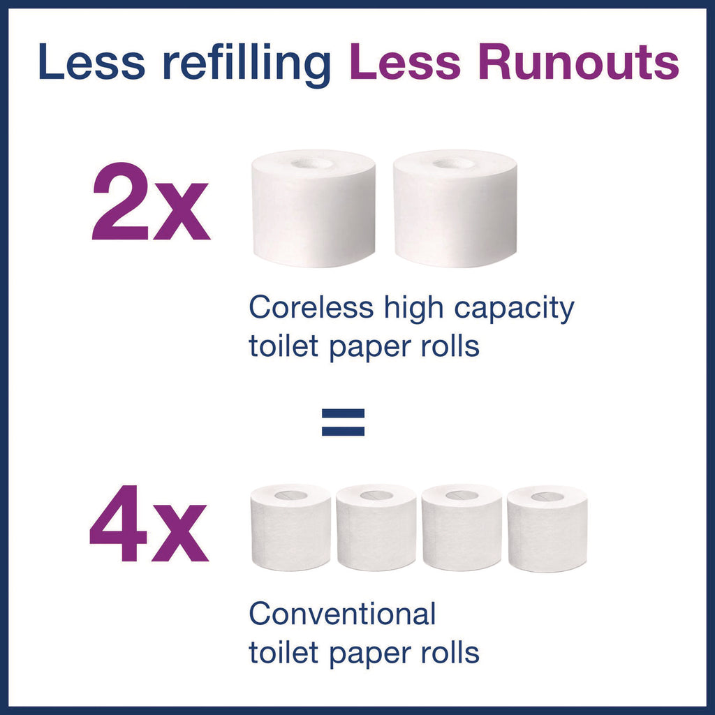 Tork® Coreless is a high-capacity coreless toilet paper system for facilities where efficiency, sustainability, and providing a great experience are key. High capacity, reduced storage space, and certified easy-to-use dispensers make it a better alternative to conventional bath tissue and jumbo rolls. These 2-ply tubeless toilet paper rolls fit a wide range of compatible coreless toilet paper dispensers to meet different restroom needs, so the same compact toilet paper refills can be used across the facility. Compared to conventional bath tissue, Tork® coreless rolls hold two times more paper, with no core and no wrap for less waste.