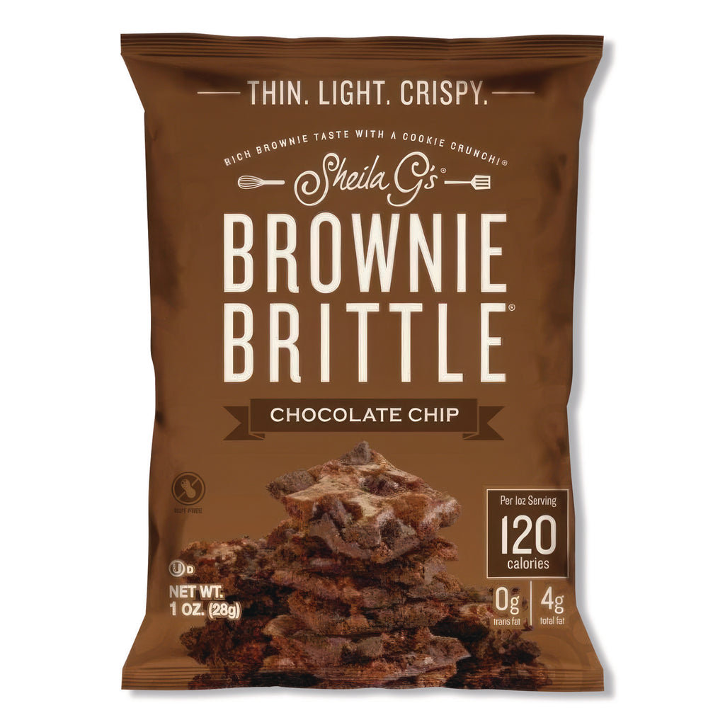 Indulge in the decadent flavor of Brownie Brittle chocolate chips snacks. Bite into this chocolate treat for a satisfying and memorable cookie-like crunch. Each piece of brittle is wafer-thin, letting you enjoy a light but crispy edge in every bite. Loaded with chocolate chips, each piece tastes like a gourmet brownie. Packaged in individual bags, these snacks are perfect for stocking break rooms or eating on the go.