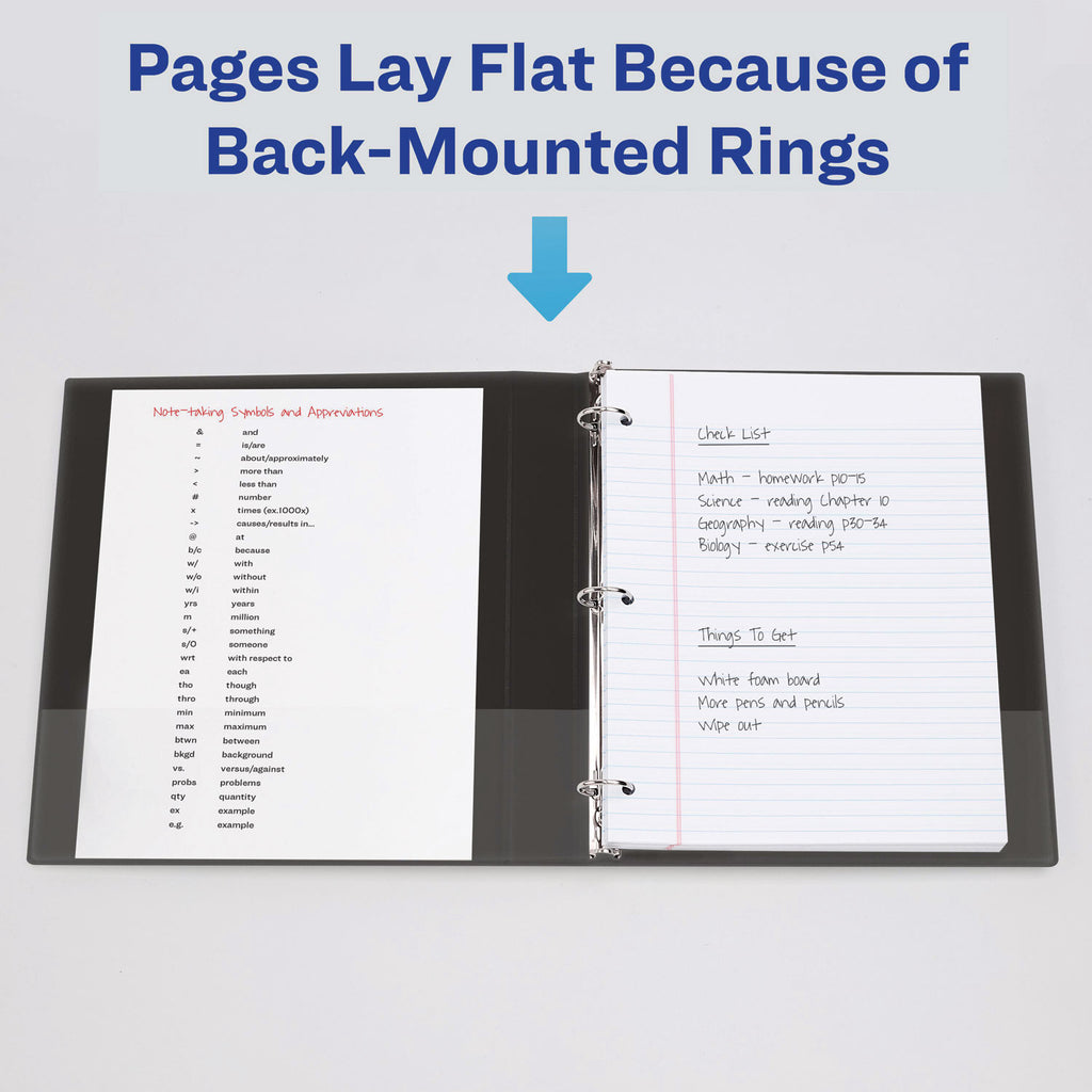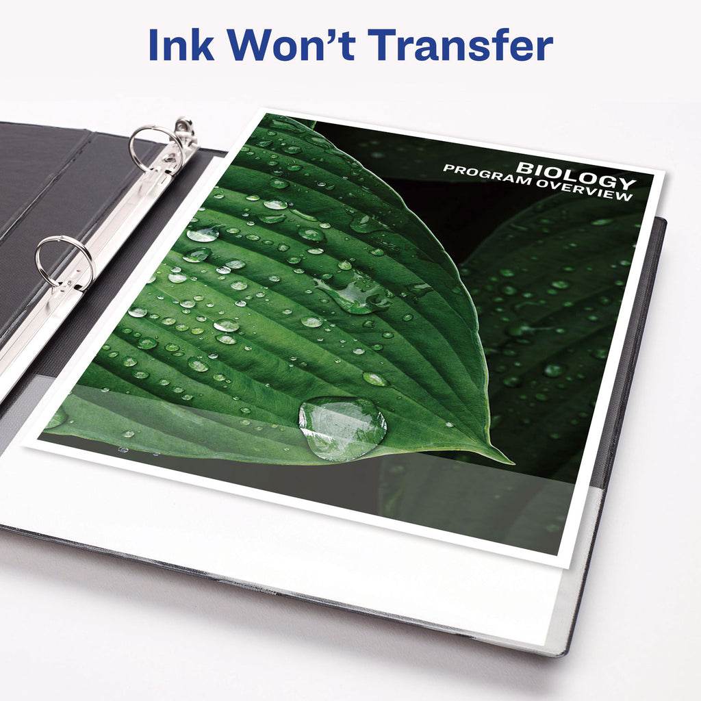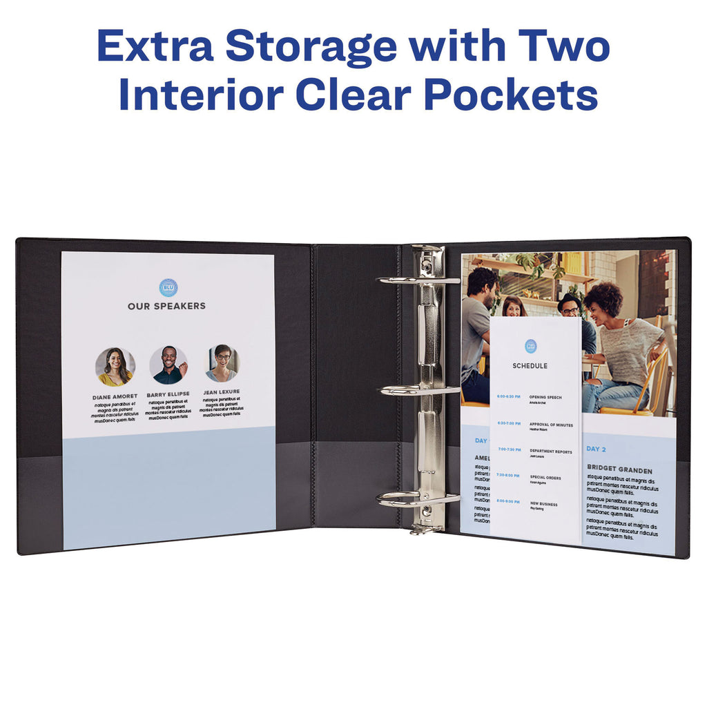 Light-use view binder. Textured clear cover hides surface damage resulting from normal use. Deep texture film offers a smoother finish and features a linen pattern for a high-quality look and feel. Pages lie flat with back mounted rings; exposed rivets on back. Two interior pockets for additional storage of loose documents. Customize cover and spine using free, easy-to-use designs and templates from Avery Design & Print.
