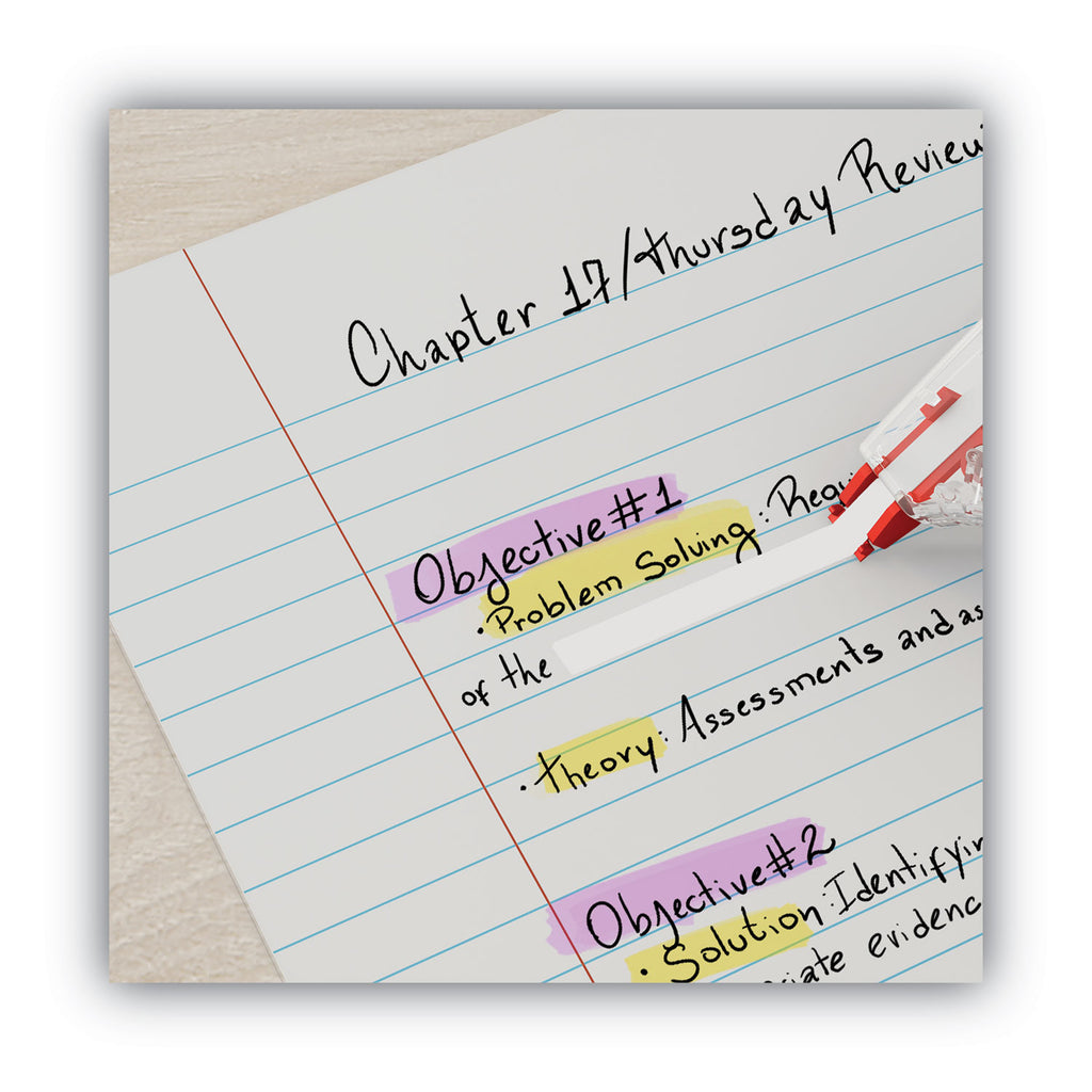 Side-apply variant of a tried and true design features improved ergonomics and a flexible tip that adjusts to your use pressure. Tear-resistant, film-based tape handles both single- and multiple-line corrections, while consistently covering print or pen marks in a single pass. Transparent casing allows you to keep an eye on your remaining supply levels. Non-refillable.