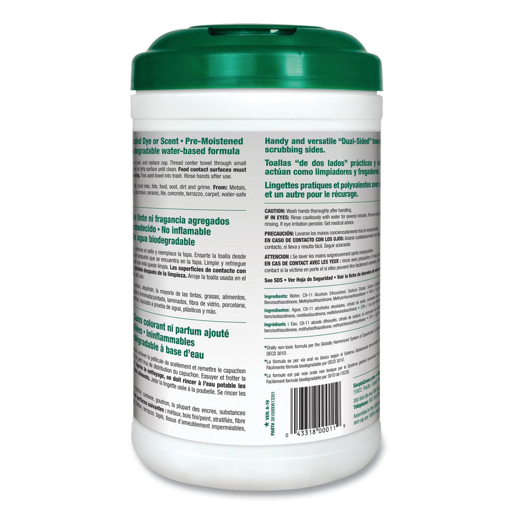 Heavy-duty, multi-purpose wipes saturated with Crystal Simple Green for powerful cleaning and degreasing. The dual-sided towels feature a scouring side for scrubbing, and a smooth side for shining. NSF registered for use in food processing facilities.