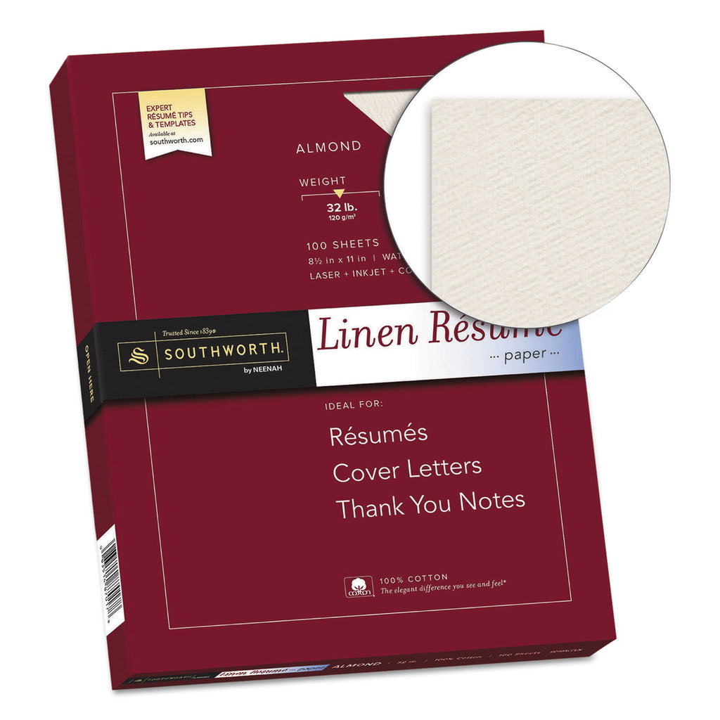Southworth® 100% Cotton Premium Weight Linen Resume Paper, 32 lb Bond Weight, 8.5 x 11, Almond, 100/Pack