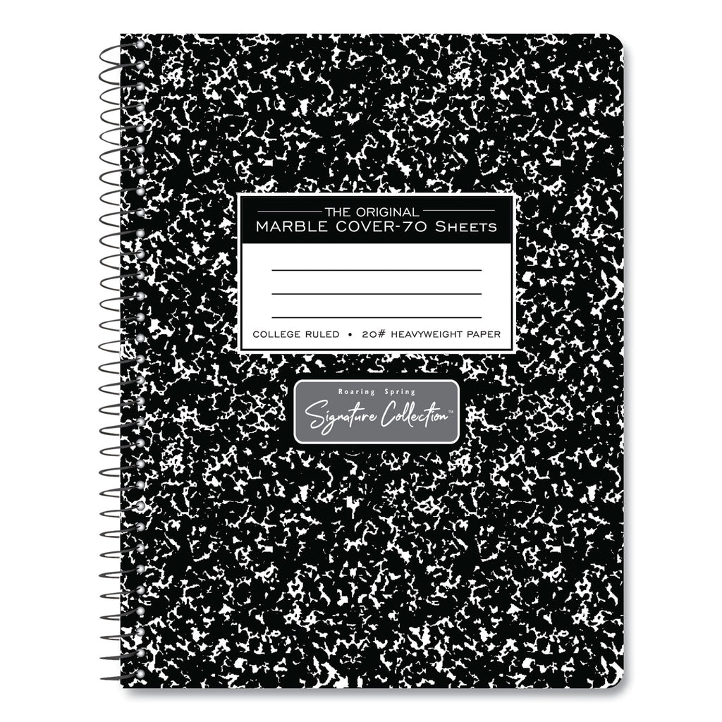 The Roaring Spring Signature Collection includes premium features such as rounded corners, lay flat design, and heavy weight perforated paper. Record your notes in this special spiral wire bound composition book. Paper is premium 20# writing paper. Pages are micro perforated for clean and easy tear outs. Cover is printed in the traditional black marble pattern.