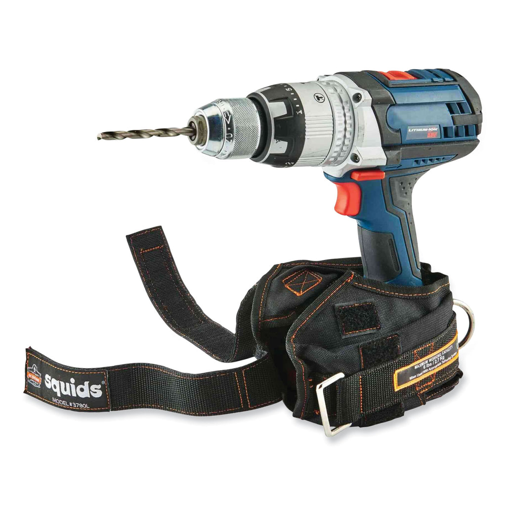 This power tool trap securely wraps around the battery portion of drills, impact drivers and other cordless power tools. D-Ring connection point attaches to a lanyard to prevent drops.