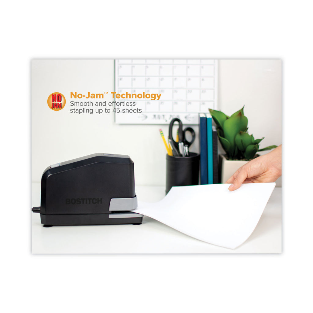 An electric stapling powerhouse with impressive speed. Impulse Drive™ technology delivers 3x faster stapling speed while No-Jam™ technology prevents staple jams for smooth, rapid repetitive stapling. Refill alert light indicates low staple supply and the push-button FastLoad™ staple refill is quick and painless. Suction cup feet provide stability during high volume stapling. Uses 1/4" (up to 20 sheets) and 3/8" (up to 45 sheets) B8® PowerCrown™ Premium Staples. Includes 1/4" B8® PowerCrown Premium staples.