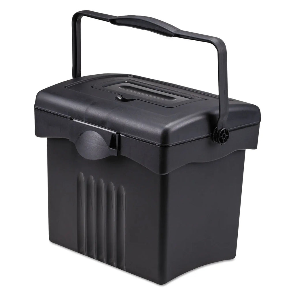 Portable file box for letter size documents. Supply compartment in lid for easy access. Latch lock accepts a padlock (not included). Unique handle design makes carrying and opening file box easy.