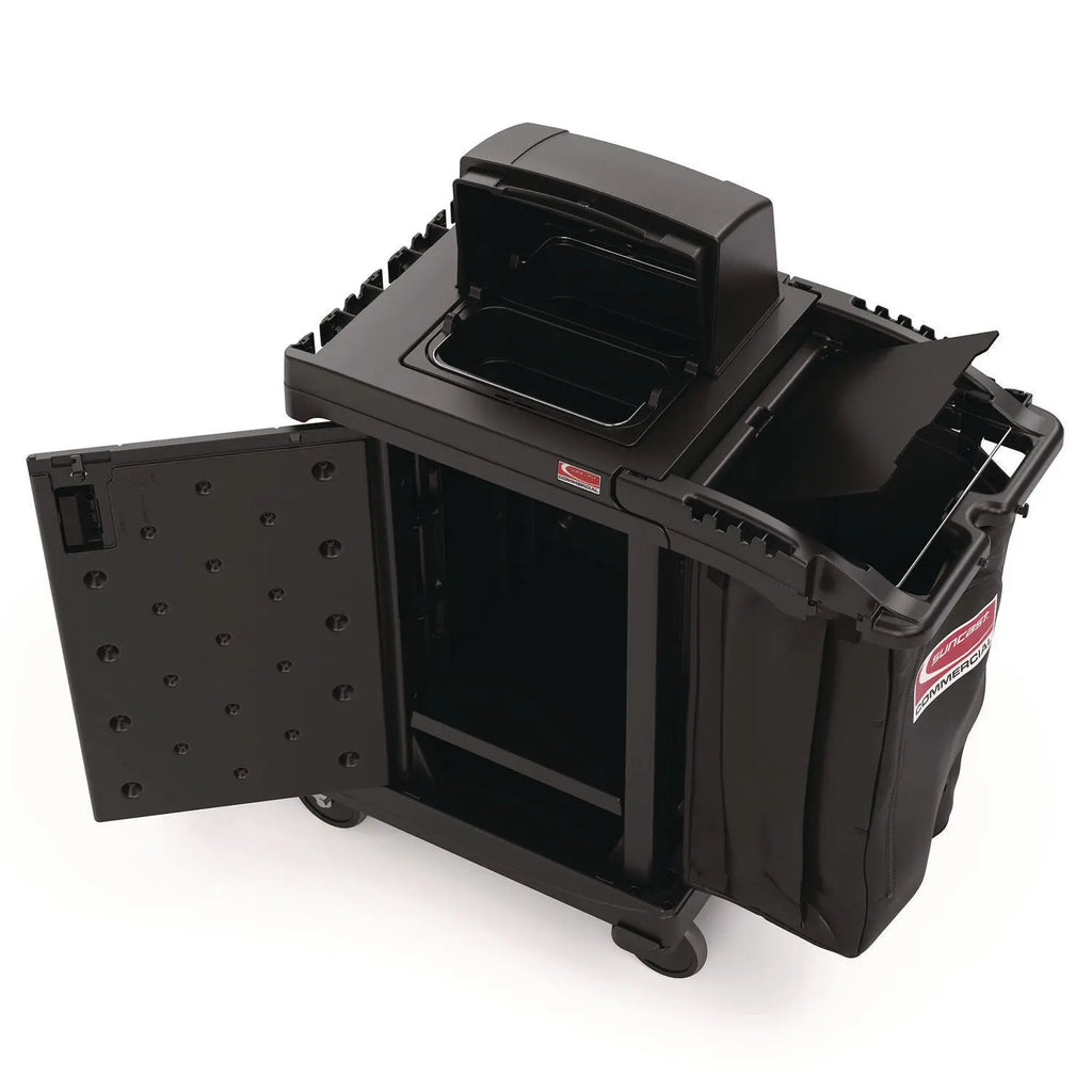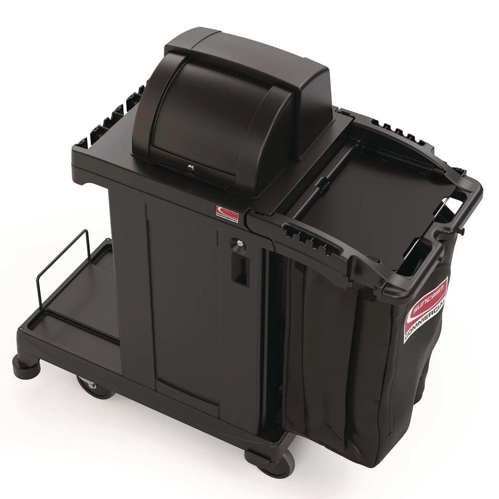The Suncast Commercial high security cleaning cart is a very secure cart with a variety of storage and organization options. With a lockable hood and lockable front door, you can store your important items that may need to stay out of sight and secure, while getting your duties done. The one large bin and two small bins provide a additional storage that may need to be easily accessible. The included spacious standard bag can be used for collecting laundry or linens, and the added lid will keep these items out of sight. This is the perfect cart for all of your janitorial and housekeeping needs.