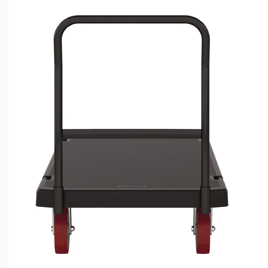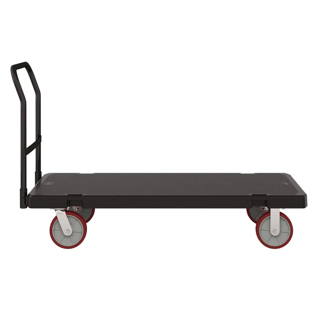 Transport heavy items in bulk with the help of this heavy-duty resin platform truck. This platform truck has a powder coated steel frame and a durable structural foam deck that's resistant to rusting, chipping, denting, and bending for heavy-duty, long-lasting use. This model features a removable handle along with 8" polyurethane casters that are non-marring and roll smoothly on different surfaces to keep your floors safe. With a 1,600 lb weight capacity, you can use this platform truck to transport heavy loads with reliability and efficiency.