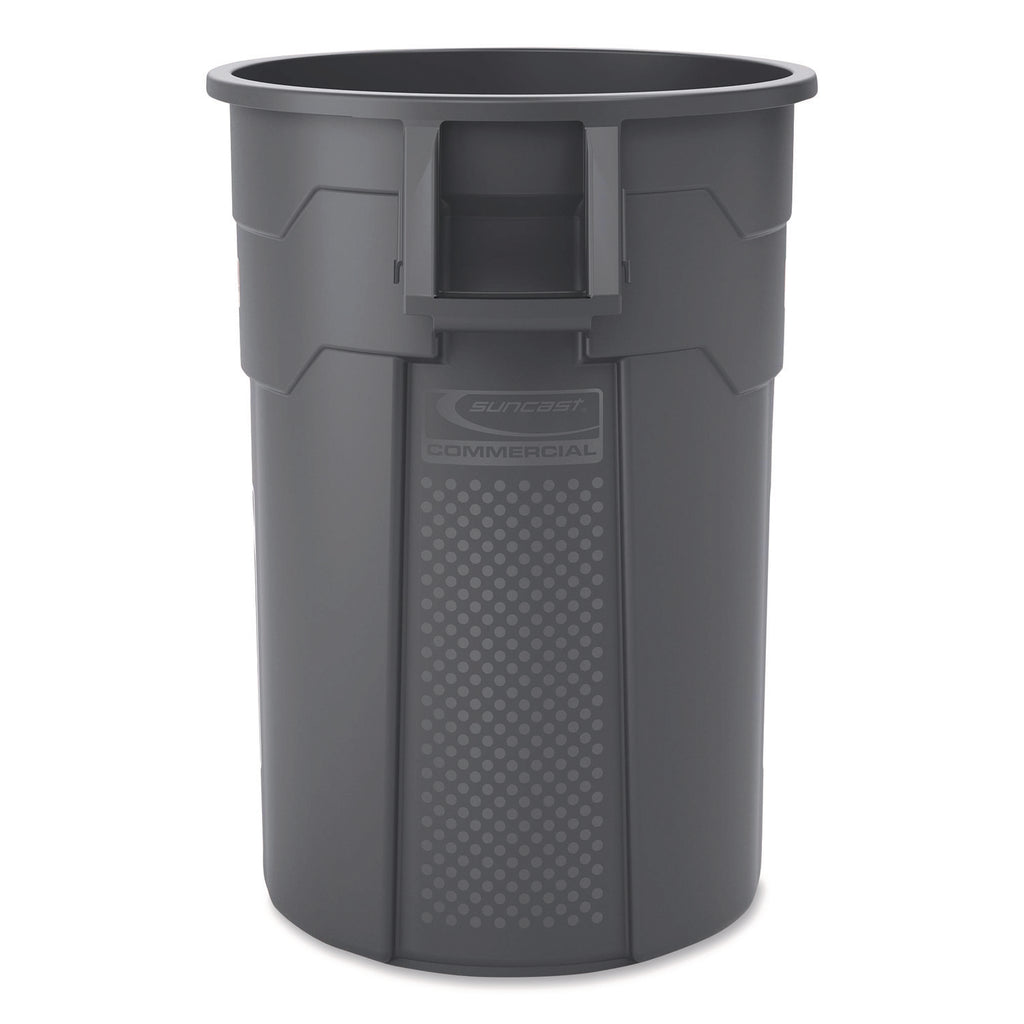 The Suncast Commercial® injection molded utility trash can is manufactured to last longer and be more durable than competing cans. This trash can will not rust and is resistant to denting and bending. The vented channels aid in reducing the force required to remove a filled can liner, while the side handles allow for an effortless lifting and easy transportation.