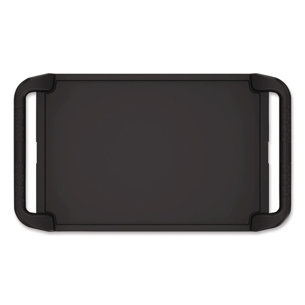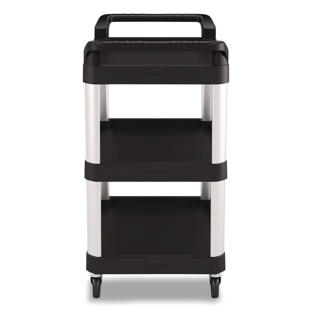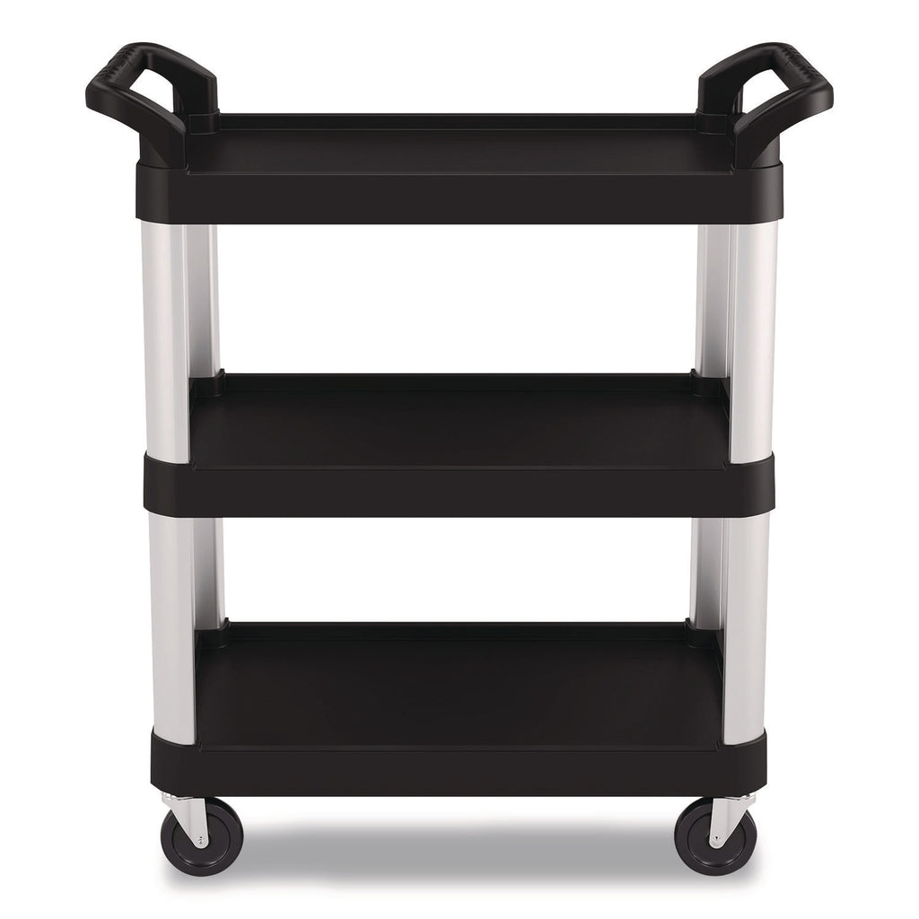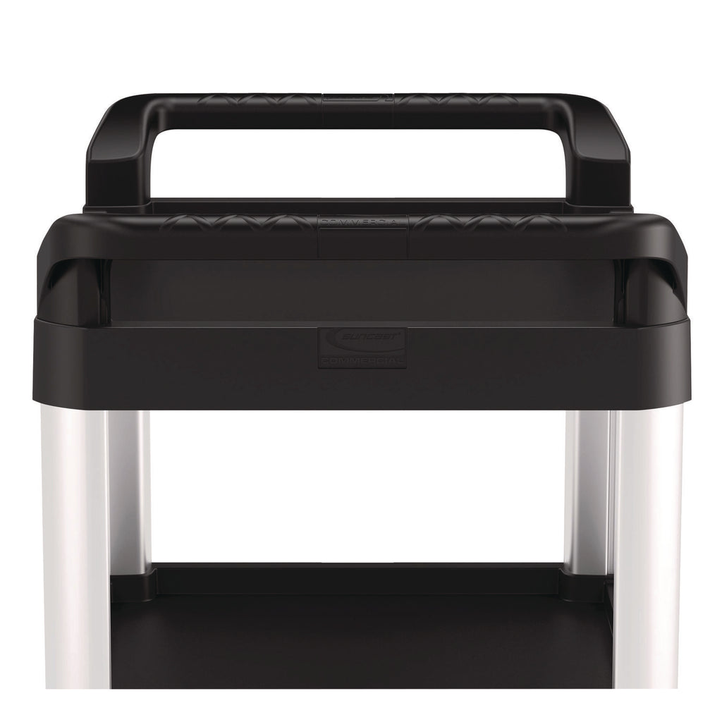 The three-shelf utility cart by Suncast Commercial® is perfect for schools, hotels and many other businesses. With polypropylene shelves and aluminum supports, this sturdy service cart was manufactured to hold up to a total of 300 lbs. The four non-marring casters provide a smooth ride when transporting from room to room.