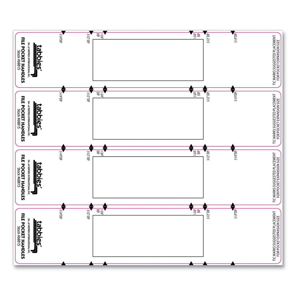 Retrieve file pockets with ease from any filing shelf. Tear resistant Tyvek® makes the handle strong and durable. Extends the life of any file pocket by preserving the gusset. Large area for labeling file for quick retrieval and easy identification. Placement guidelines for the three most popular expansions for file pockets: 1 3/4", 3 1/2", and 5 1/4".