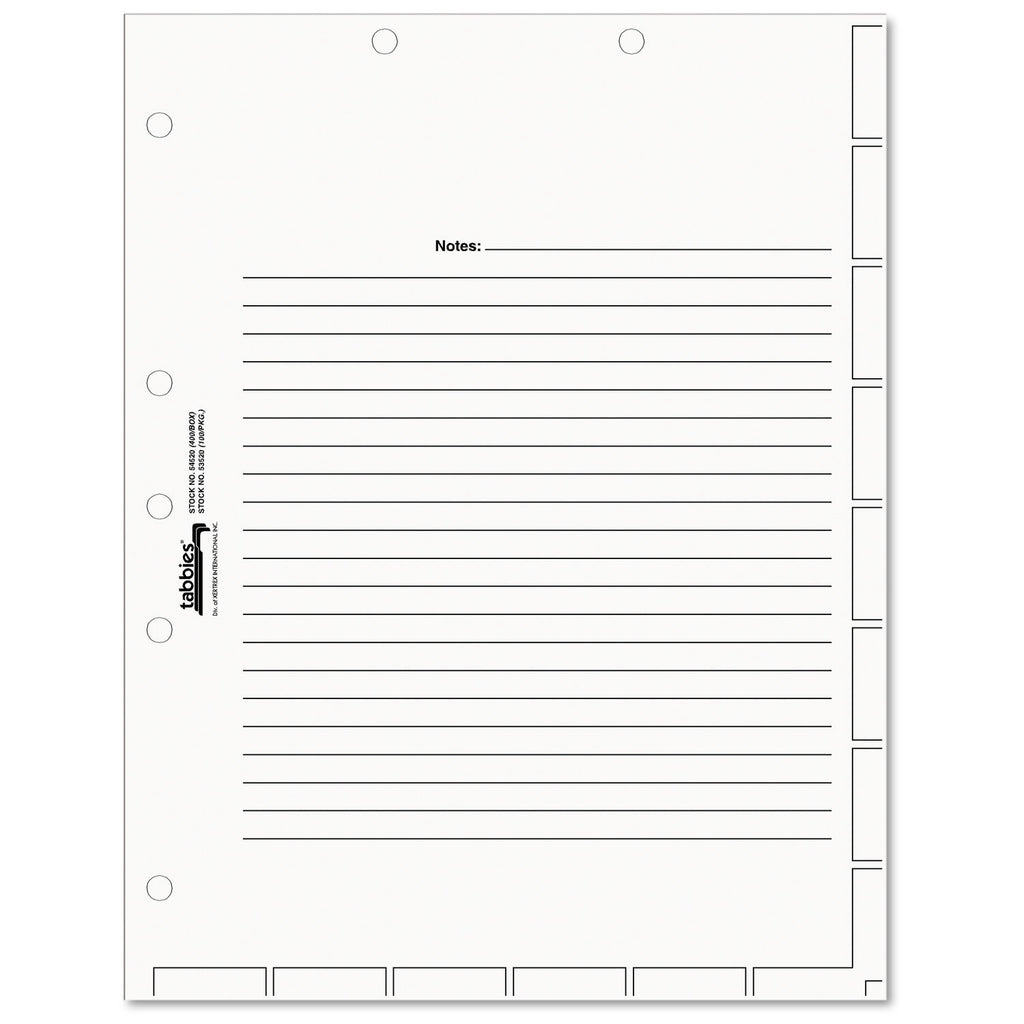 Divider sheets are 110-lb. stock printed with guidelines for fast and accurate placement of medical chart divider index tabs. Sheets are conveniently ruled for making notes and are 7-hole punched to be used with fasteners in folders or 3-ring binders.