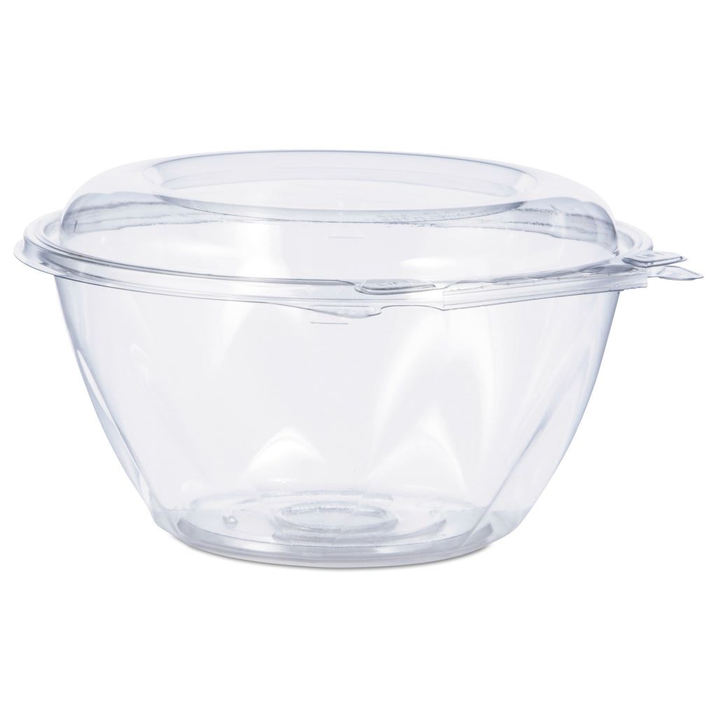 TamperAlert hinge protrudes outward when torn, alerting the customer that the container has been opened. Hinge remains attached to the container, meaning no loose plastic pieces and therefore no littering. MicroTrim edge contributes to tamper-resistance by inhibiting the ability to lift up the lid from the base without tearing the hinge. 360 degree leak-resistant perimeter seal completely seals entire tray for maximum freshness and to prevent leaks. Recessed stacking platform provides greater stability of merchandising displays. Offset opening tabs and lift and hold embossing makes SafeSeal bowls easier to open. Crystal clear container with minimal sidewall ribbing.