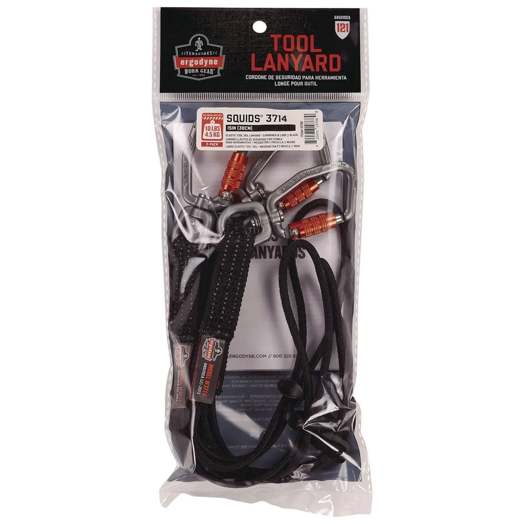 This elastic tool tail lanyard features a swiveling self-locking captive-eye aluminum carabiner on one end and a low-profile cinch loop on the other to tether tools up to 10 lbs and prevent dropped or falling objects from occurring on the job. Its 15" length helps reduce fall distance in the event of a drop and also keeps tools statically tethered to belts, pouches, bags and other anchoring or storage locations. This lanyard is constructed with flexible elastic webbing to reduce snag hazards and tangles. The low-profile cinch loop end easily fits into small captive holes in tools that can otherwise be challenging to tether. With a captive eye design, the self-locking carabiner securely tethers tools while better predicting load direction and preventing the lanyard from sliding into the carabiner gate. The carabiner's swiveling design prevents binding and tangling when being used with rotating tools like screwdrivers. For best use, either tape the loop end onto a hand tool with Squids 3755 Self-Adhering Tape Trap or use the cinch loop or carabiner end to tether tools with captive holes. To complete the tethering system, attach the opposite end to a Squids Wristband Anchor or other anchoring location for convenient tethering. When working at heights, it's essential to tether your tools as part of your fall protection plan. This tool lanyard is built to withstand defined weight limits and can easily be used by any worker to help avoid accidentally dropping objects that could cause damage, injuries or possibly death. Ideal for those who need to tether tools in industries like construction, telecommunications, oil and gas, power generation, utilities, wind energy, manufacturing or other jobs at heights.