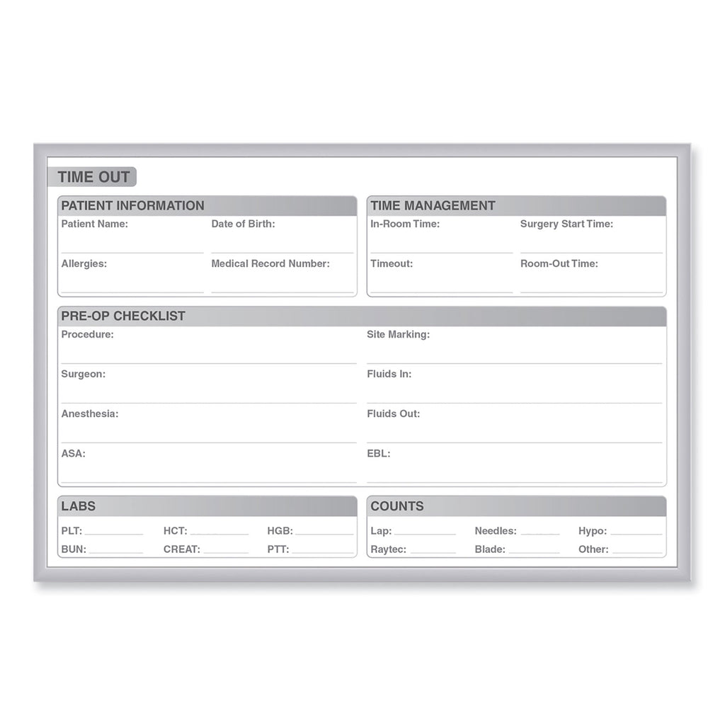 Visually track checklists for surgeries and other procedures with this pre-printed Time Out whiteboard to improve retention of important information. The graphics improve communication and reduce anxiety for patients and employees. The entire surface easily wipes off with a soft cloth, disinfectant wipe, alcohol or water. Resistant to bacteria and germs, which helps with infection prevention. Each board comes in a sleek 0.25 aluminum frame and includes a detached SmartPak tray. Graphics are produced in gray to seamlessly match any interior and will never stain, ghost or fade. Ships in Ghent's worry-free packaging, designed specifically for shipping whiteboards.