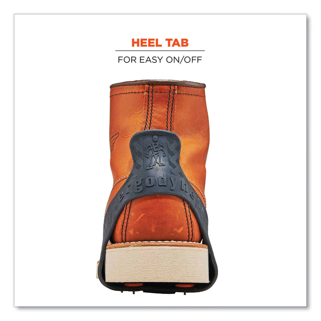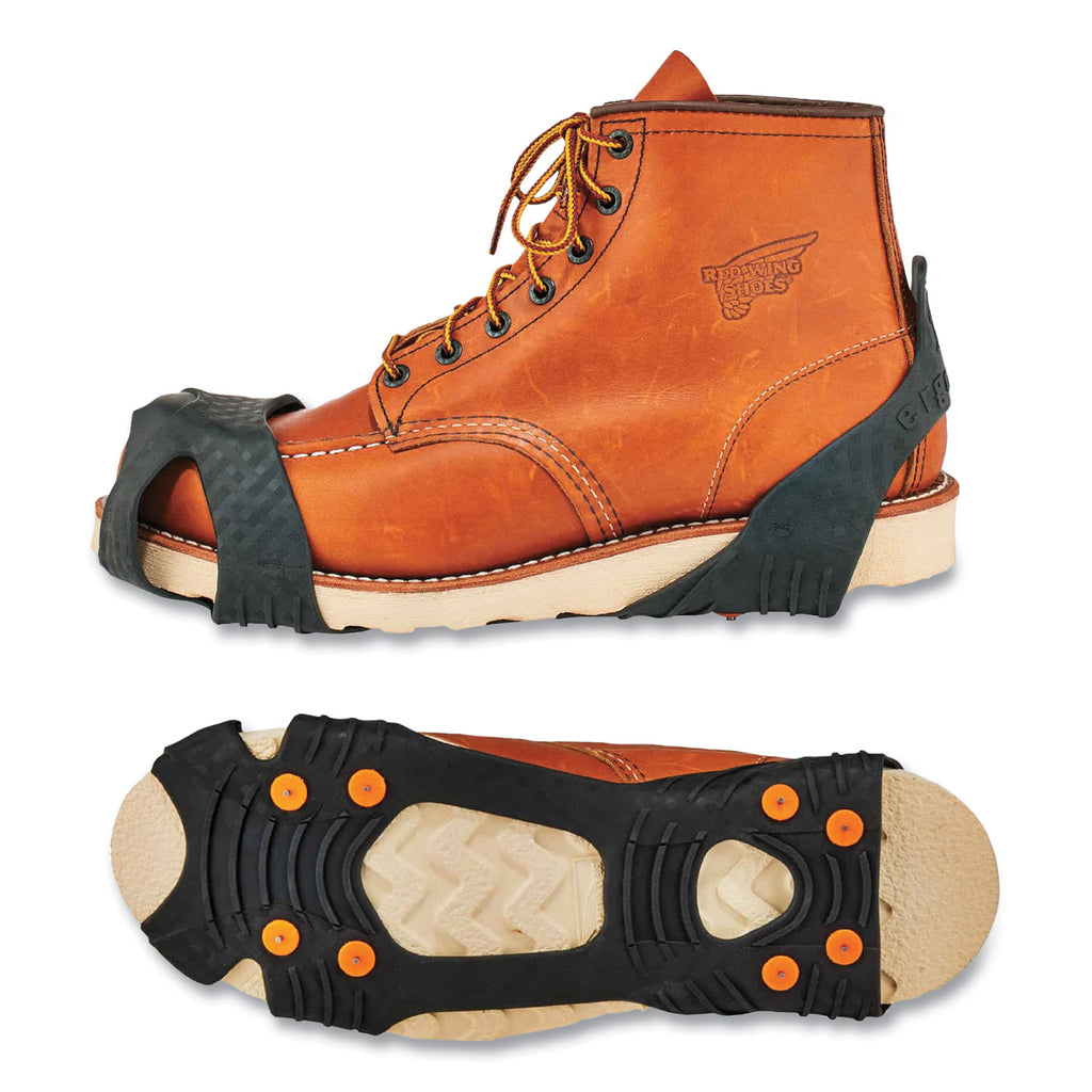 Tungsten carbide slip-on ice cleats are lightweight ice grips for boots and shoes that provide tenacious traction and extra stability on ice and snow. One-piece design offers grip to prevent slip and fall injuries on the ice. These ice grippers feature eight rugged tungsten carbide cleats on the ball and heel of foot for extra-firm grip on slippery terrain. Tungsten Carbide is a very hard compound. It rates 9 on the Mohs scale for hardness, second only to a diamond. Because it is so hard, the spike can be thinner, providing better penetration and sharper grip. These will fit over any style of boot or shoe for traction and stability during winter work or other winter outdoor activities. Tested to be flexible in temperatures down to -40°F (-40°C), the stretchable rubber material provides a secure fit and easy slip on/off wear. These snow cleats are lightweight and can be folded small enough to be stored in a pocket or pack when not being worn.