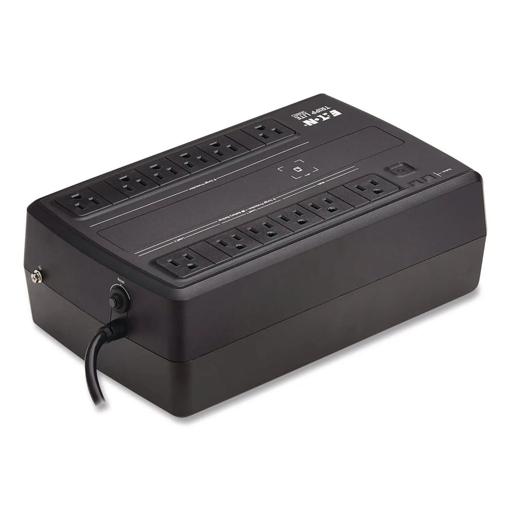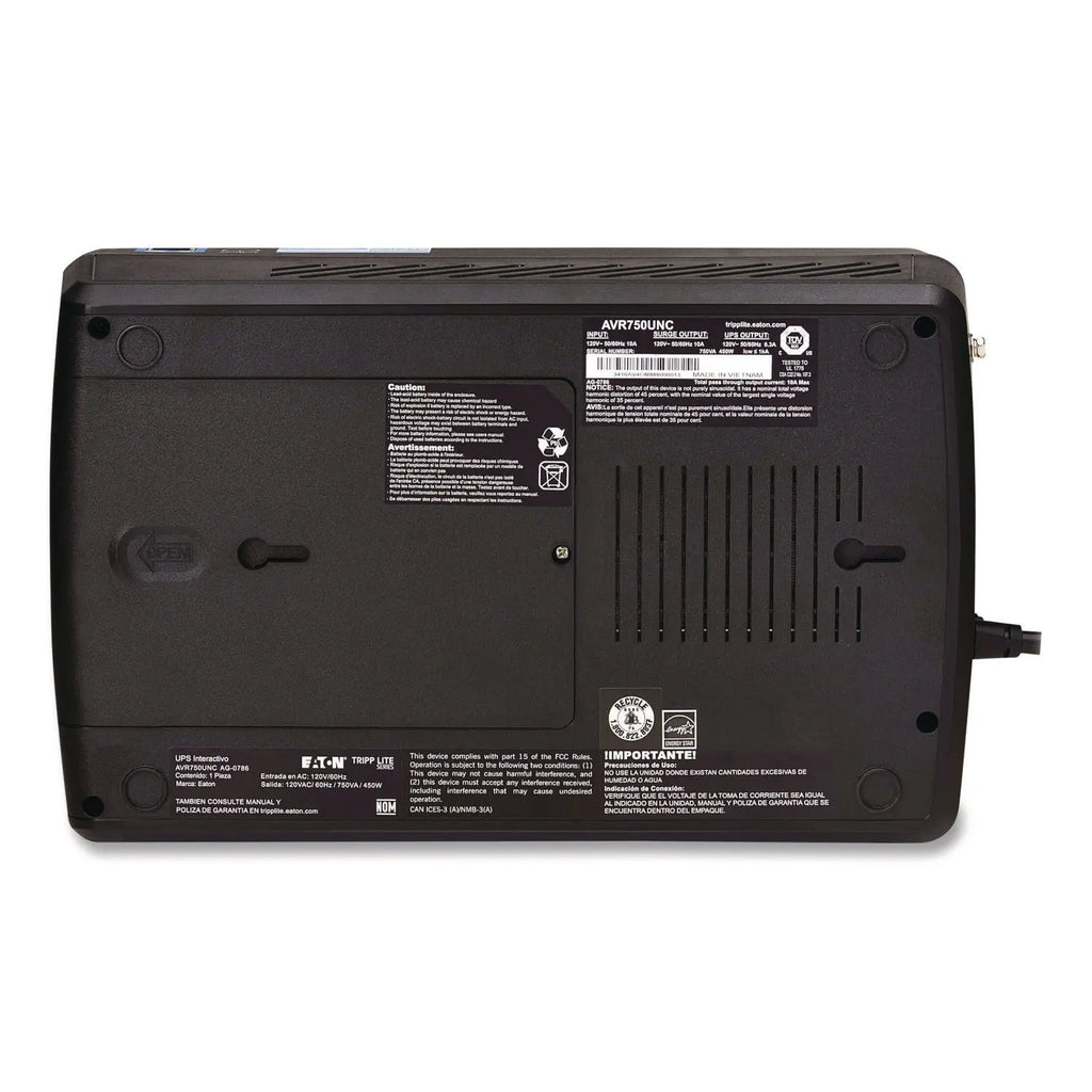 The AVR750UNC line-interactive cloud-connected UPS system with AVR protection provides reliable battery backup and AC power protection against blackouts, brownouts, overvoltages, surges and line noise for computers, routers, gaming systems, ATMs, security systems, digital signage and other home/office networking equipment. Easy-to-use Cloud-enabled remote monitoring powered by Brightlayer, Eaton's Cloud-based remote monitoring app, offers convenient setup, control and management of a single UPS or a larger deployment. Scan the QR code on the UPS to download the app to your mobile device. Receive alerts, push configurations, silence alarms or control outlet banks using a mobile app or web browser. Being able to monitor and access an army of UPS systems from a remote location helps reduce the number of site visits, saving you time and money. The unit's NFC (Near-Field Communication) area lets you configure network settings instantly from your mobile device. Allows time to back up critical files during a blackout; it restarts automatically once power is restored, regardless of battery charge level, saving you a costly site visit. During short blackouts and brownouts, it switches to battery power to keep connected equipment running. This allows you enough time to save data and complete a safe shutdown in case of a longer outage. Premium protection from surges and line noise helps your equipment perform better. Rated for 316 J of surge suppression, the unit and all 12 NEMA 5-15R outlets protect connected devices from the harmful effects of power surges. Filters out disruptive electromagnetic interference (EMI) and radio frequency interference (RFI) that can destroy data and contribute to lengthy downtime. Four outlets are set apart from the others to allow connection of bulky transformers.