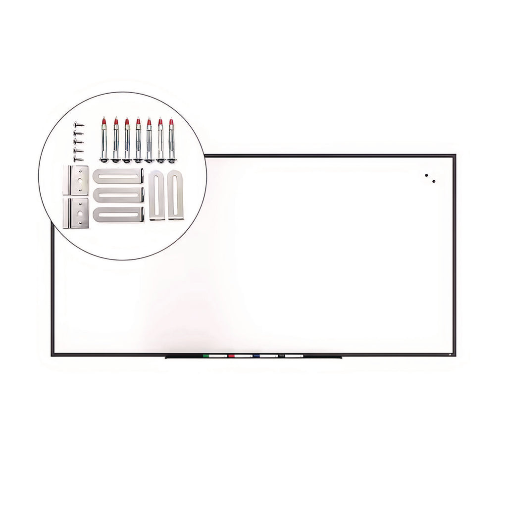 - Includes mounting kit, accessory tray, and four TRU RED assorted chisel tip dry erase markers.